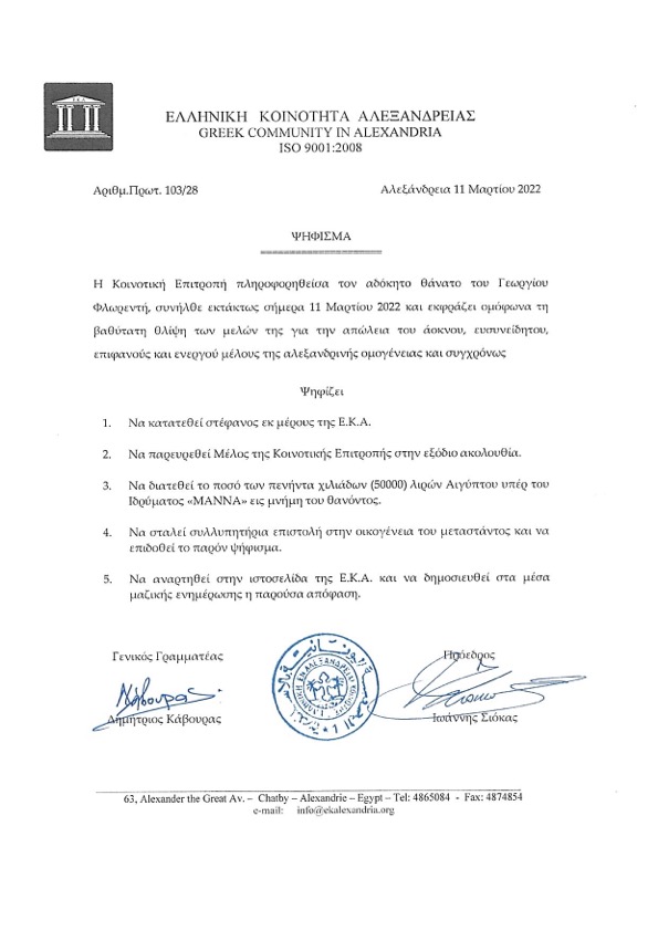 Μετά την είδηση για την ξαφνική απώλεια του Αλεξανδρινού Γεωργίου Φλωρεντή, η Κοινοτική Επιτροπή της Ελληνικής Κοινότητας Αλεξανδρείας εξέδωσε ψήφισμα, το οποίο παρατίθεται στη συνέχεια