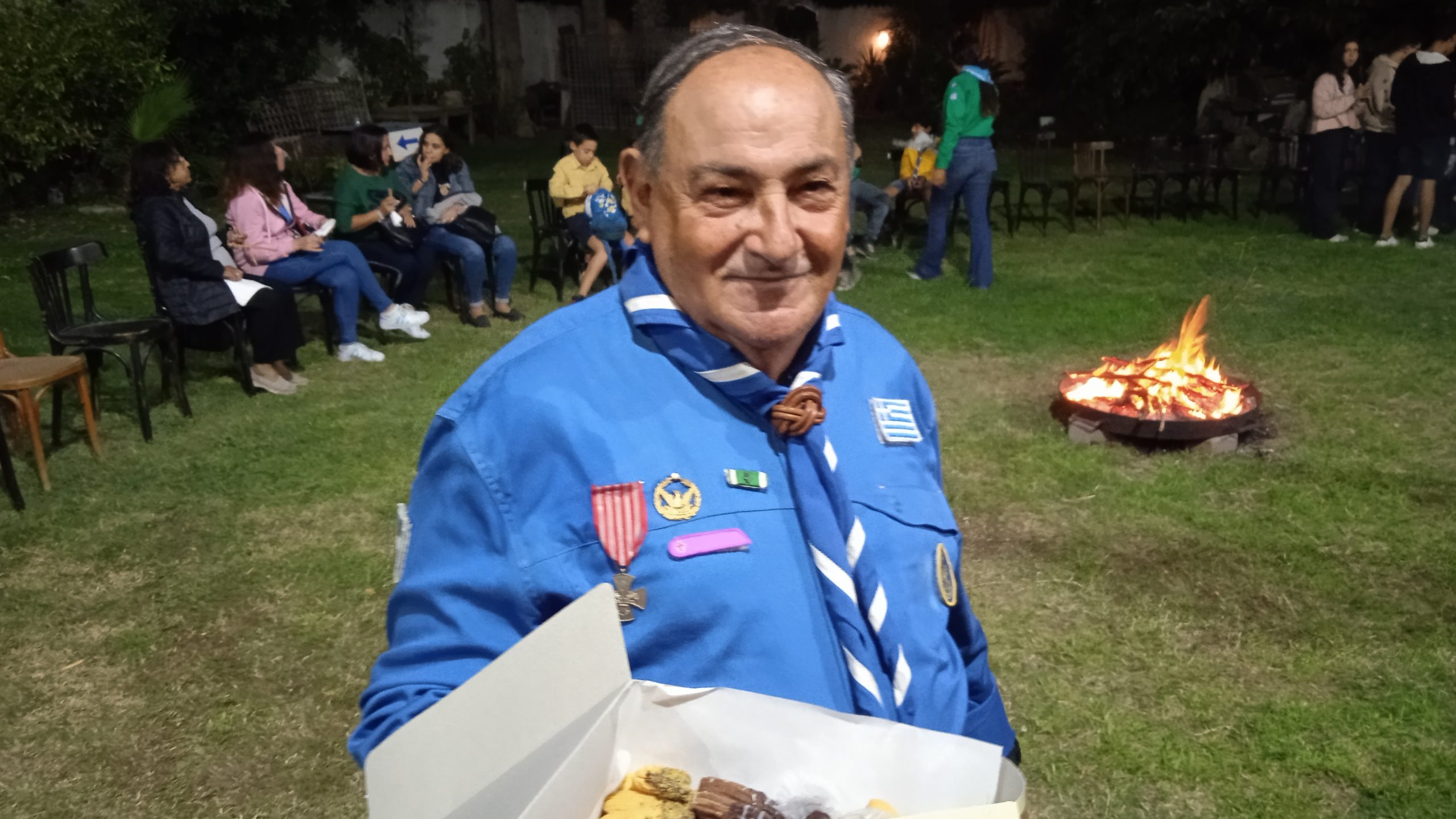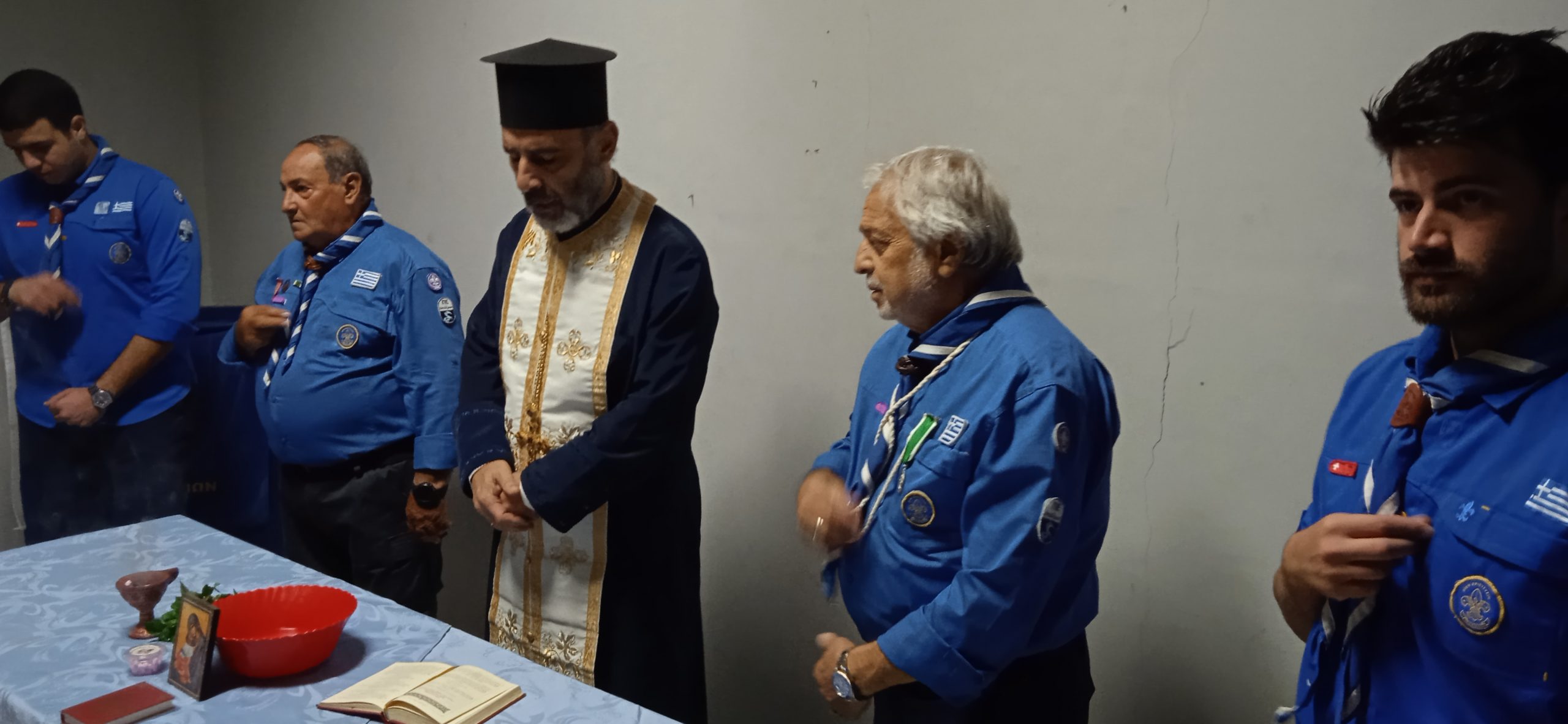 Ο Πρωτοπρεσβύτερος Πατήρ Πάνος Γαζής που ιερουργεί στην Αλεξάνδρεια, με την καθάρια και δυνατή φωνή του ευλογεί την έναρξη και ραντίζει με αγιόνερο σώματα και ψυχές, για να είναι η χρονιά επιτυχημένη. Οι φίλοι του Προσκοπισμού προσεύχονται μαζί του. Οι παλιές «καραβάνες» ο Έφορος Διοίκησης των Προσκόπων κ. Άρης Μαρκοζάνης και ο Αρχηγός κ. Τζόνι Μύρος, μαζί με τους νεότερους Γιώργο και Φίλιππο, πλαισιώνουν τον αγαπητό ιερέα με πρόσωπα ικανοποίησης για την επιτυχημένη συγκέντρωση.