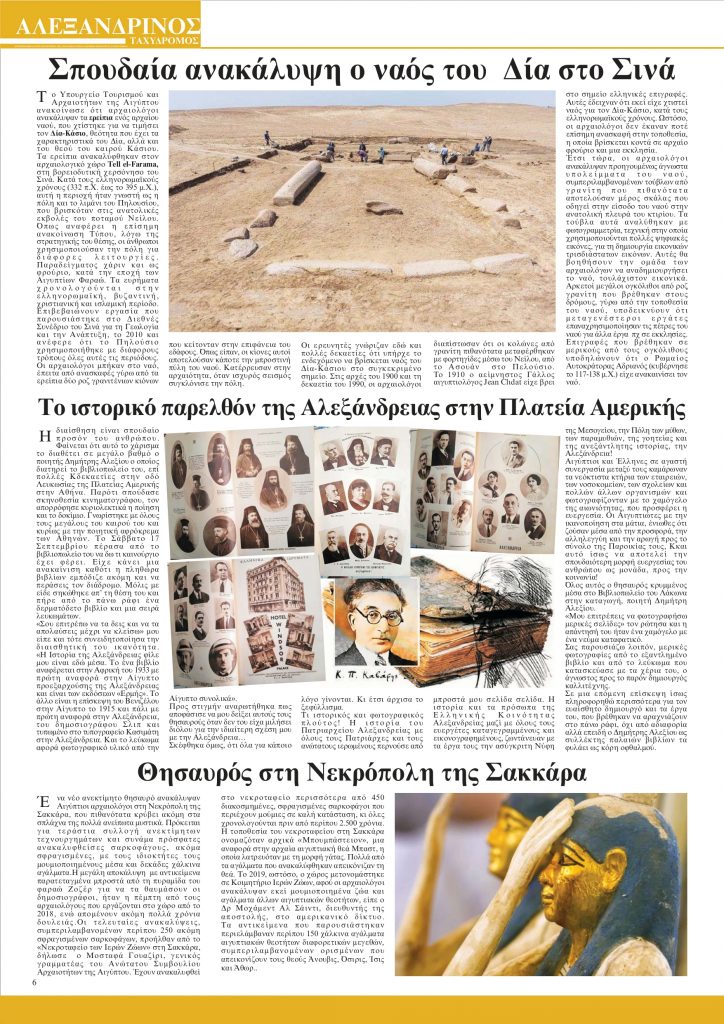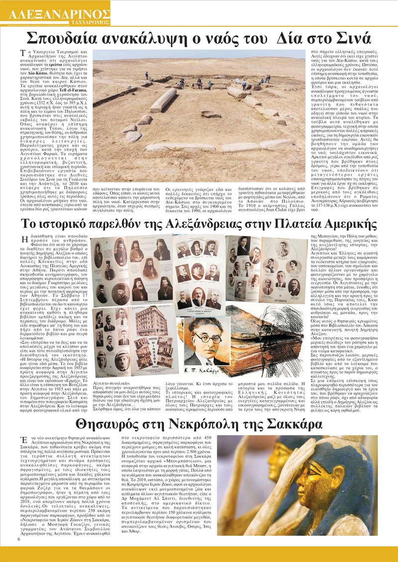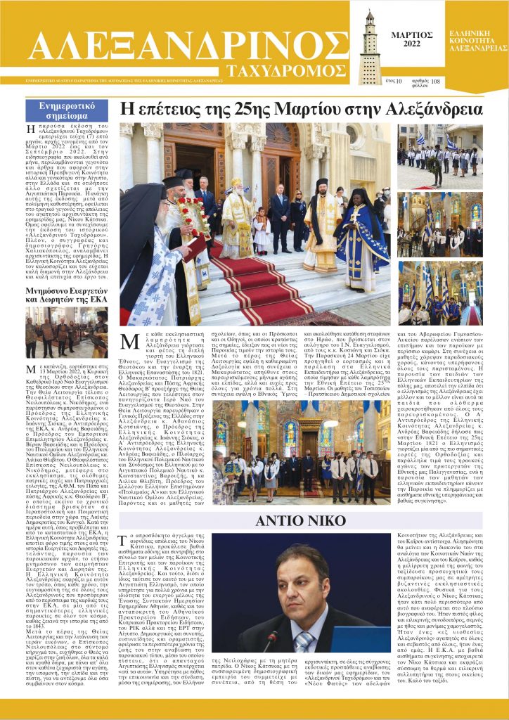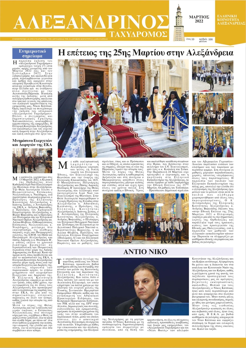 [Η εφημερίδα “Αλεξανδρινός Ταχυδρόμος” κυκλοφόρησε με επτά μήνες καθυστέρηση, εξαιτίας της τραγικής απώλειας του αρχισυντάκτη Νικόλαου Κάτσικα. Φροντίσαμε να δημιουργηθεί ένα έντυπο συμπεριλαμβανομένων των -7- τευχών, έτσι ώστε οι αναγνώστες να μπορούν να δουν καταγεγραμμένα τα σημαντικότερα γεγονότα ανά μήνα]