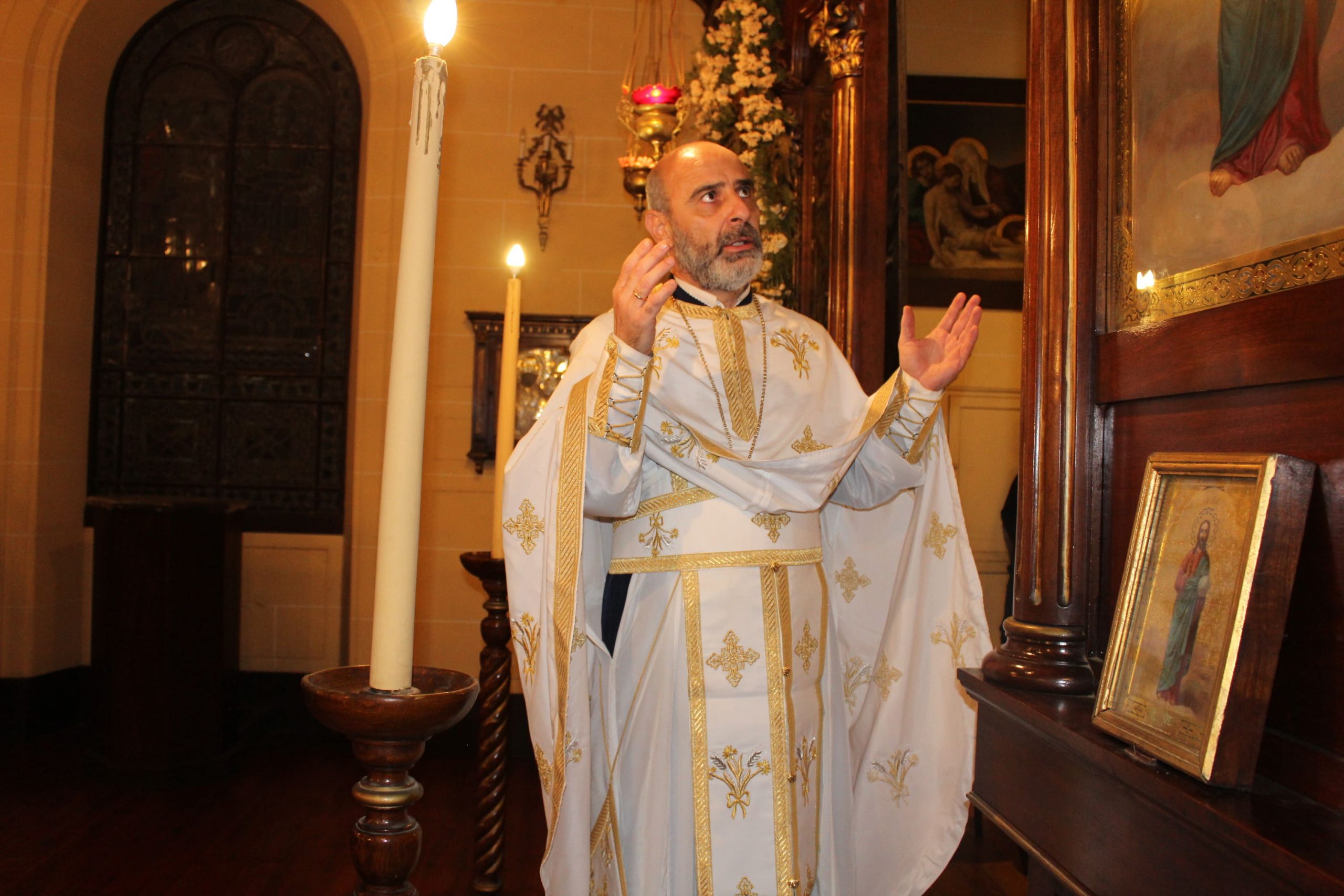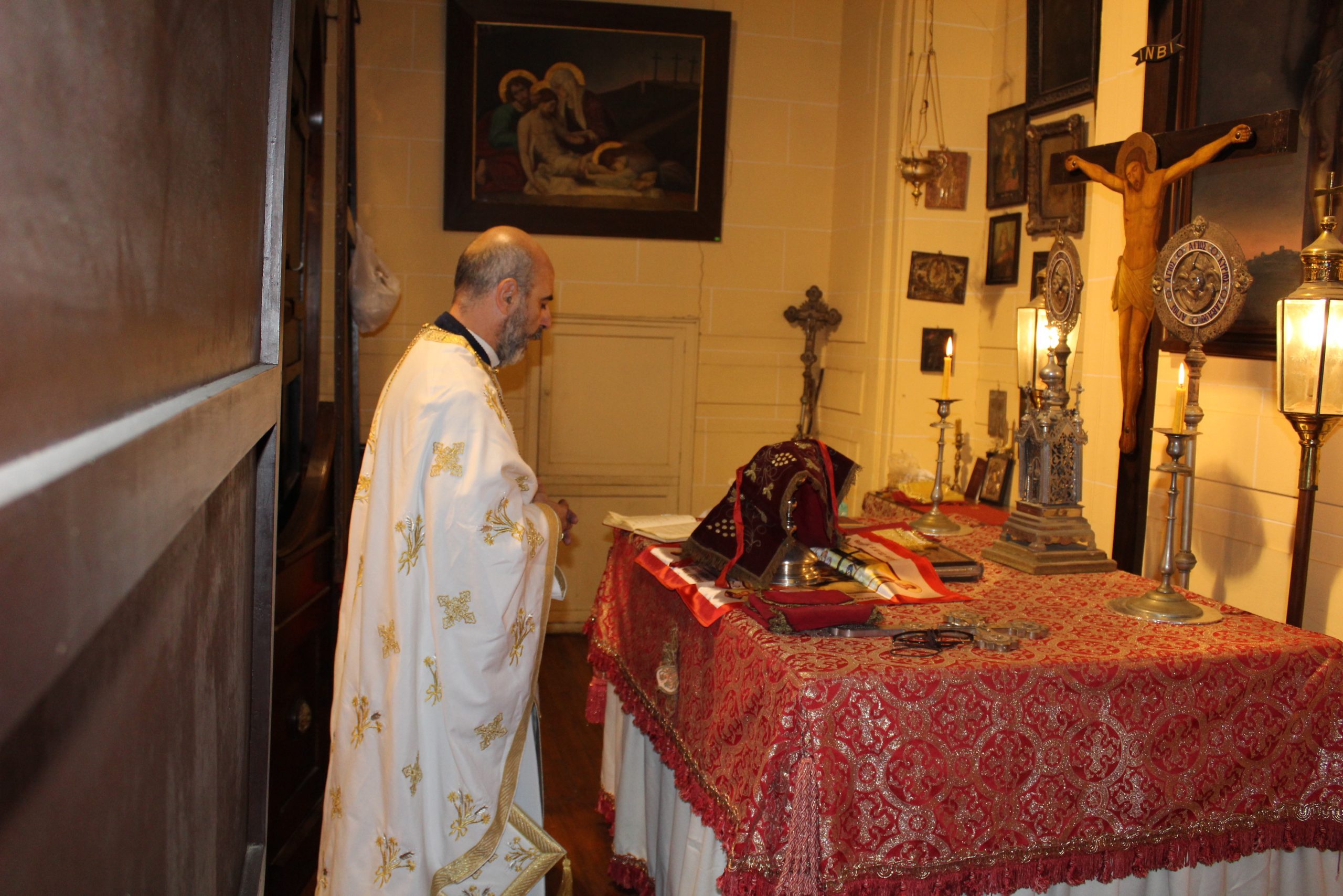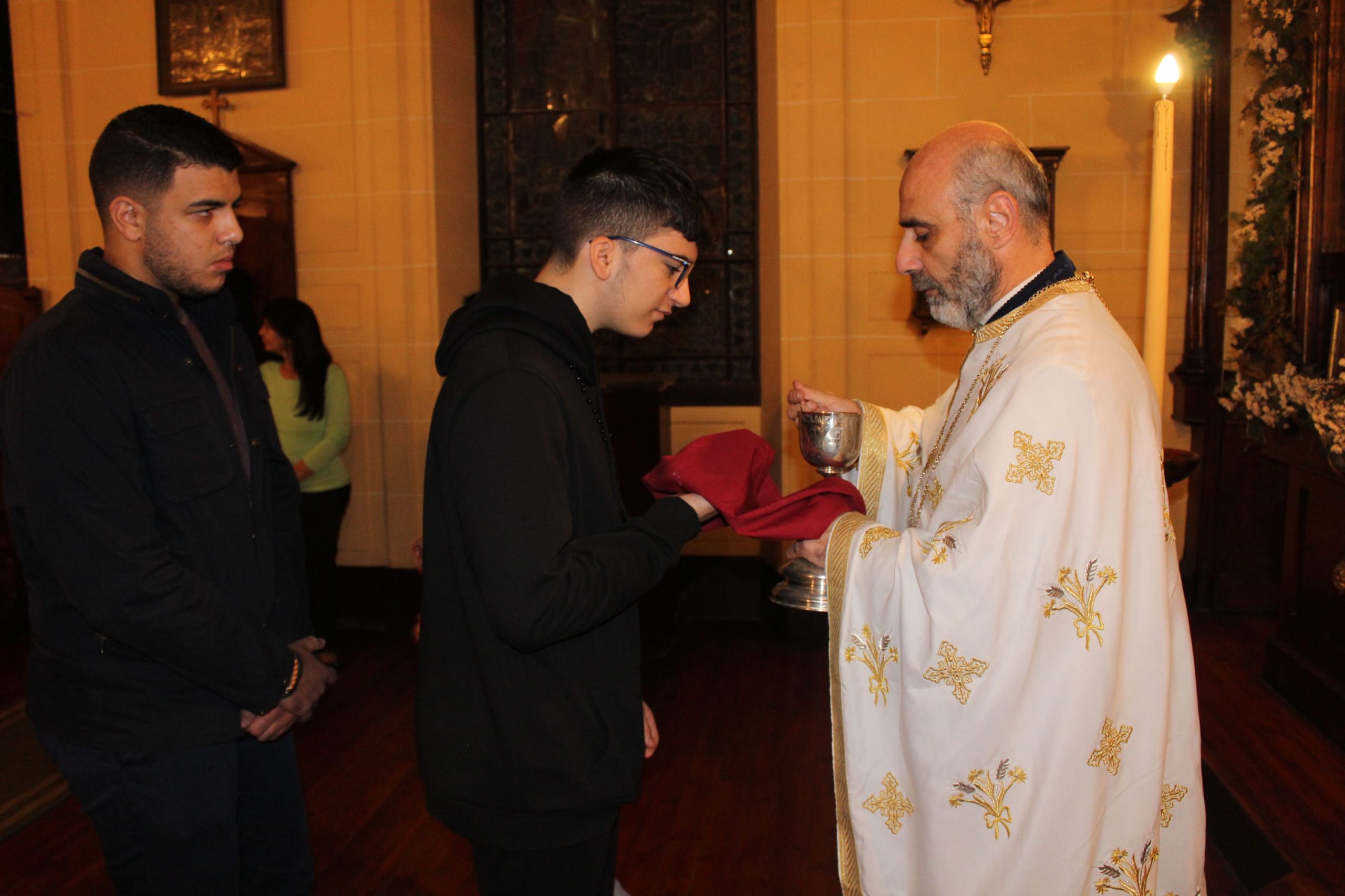 Στο Παρεκκλήσι τη Θεία Λειτουργία τέλεσε ο αγαπητός σε όλους Πρωτοπρεσβύτερος Πάνος Γαζής ο οποίος συνάμα είναι και δάσκαλος του Δημοτικού Σχολείου, ενώ έψαλλε ο Στράτος Γαζής, μαθητής Έκτης Τάξης. Στη Θεία Λειτουργία παρευρέθηκαν ο Γενικός Πρόξενος κ. Αθανάσιος Κοτσιώνης, μετά της συζύγου του Ιωάννας και όλοι οι εκπαιδευτικοί προεξαρχόντων των Διευθυντών τους κας. Πασχαλίνας Αγαπιάδου και κ. Κωνσταντίνου Ρήγα. Στο τέλος οι μαθητές κοινώνησαν και όλοι πήραν το αντίδωρο απ’ τα χέρια του Πατρός Πάνου.