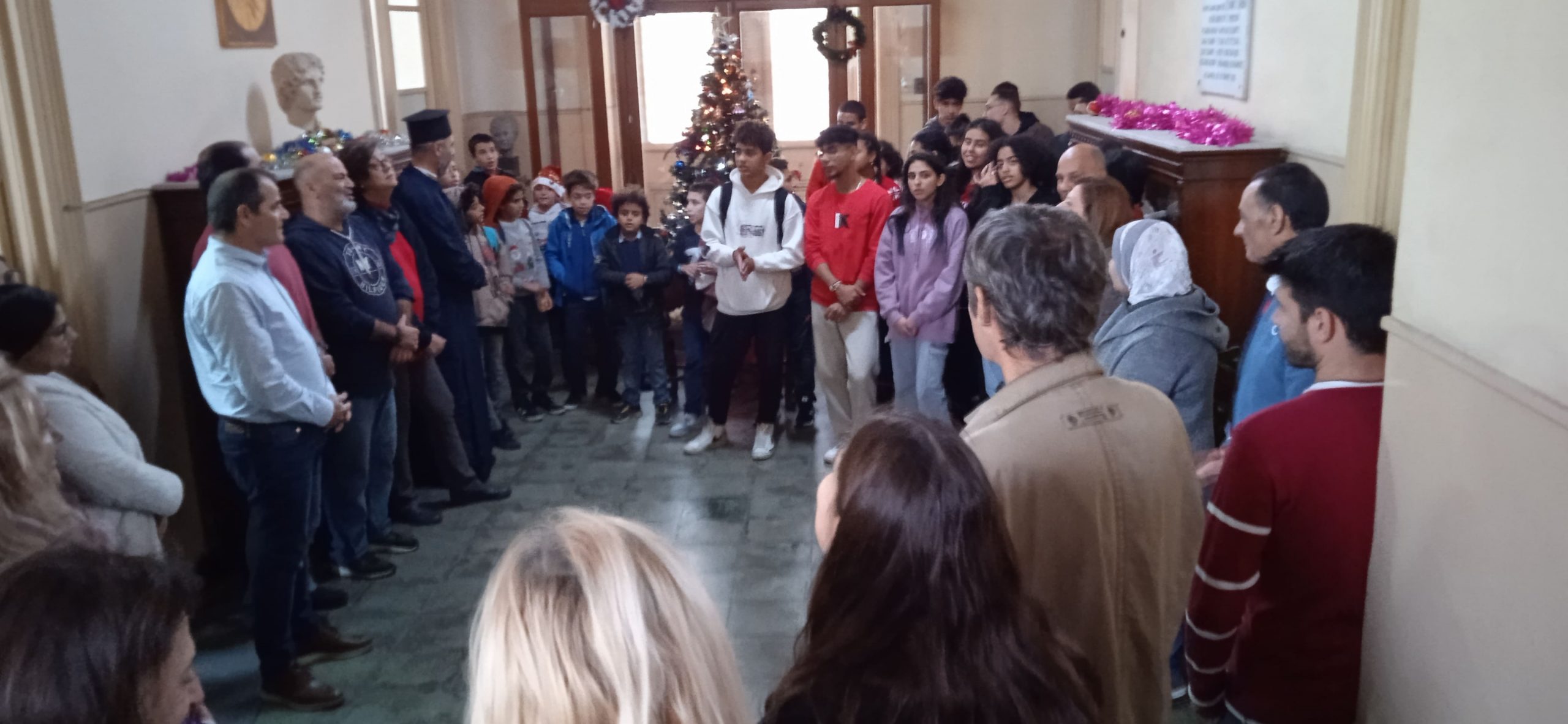 Όμως η γιορτινή υποχρέωση της μαθητικής χριστουγεννιάτικης χορωδίας, έπρεπε να ανέβει τώρα τα σκαλιά της Ελληνικής Κοινότητας Αλεξανδρείας. Κι έτσι γέμισε ο διάδρομος των Γραφείων της ΕΚΑ από τα γέλια, τις φωνούλες και τα κάλαντα των παιδιών. Μπροστά απ’ το στολισμένο δέντρο της Ελληνικής Κοινότητας, οι στίχοι των εορτινών ασμάτων απλώθηκαν σε όλους τους χώρους.