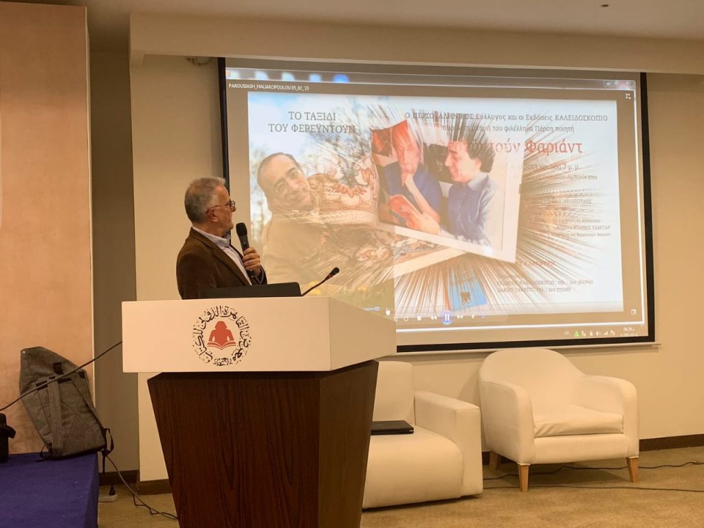 Η κα. Σταυρούλα Σπανούδη αφού πρώτα καλωσόρισε τους παρευρισκομένους. εισήγαγε στο κοινό, το πνεύμα των έργων του συγγραφέα κυρίως μέσω του βιβλίου με τον τίτλο «Το Ταξίδι του Φερεϋντούν» των εκδόσεων «Καλειδοσκόπιο».