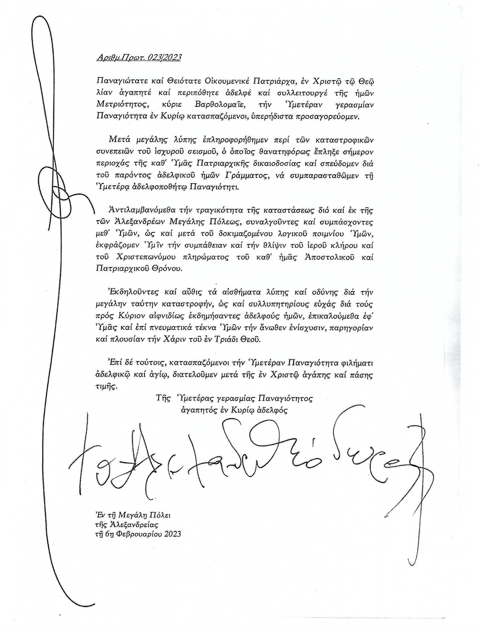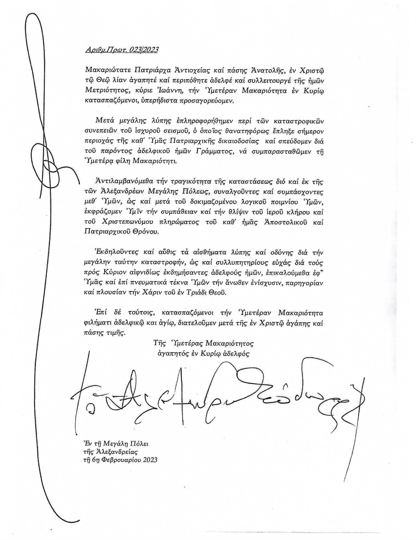 Η ΑΘΜ ο Πάπας και Πατριάρχης Αλεξανδρείας και πάσης Αφρικής κ.κ. Θεόδωρος Β’, πληροφορηθείς τις άκρως καταστροφικές συνέπειες του ισχυρού σεισμού που έπληξε σήμερα, 6η Φεβρουαρίου ε.ε. περιοχές της νοτιοανατολικής Τουρκίας και της Συρίας, στερώντας την ζωή σε δεκάδες συνανθρώπων μας, απέστειλε Πατριαρχικά Γράμματα προς την ΑΘΠ τον Οικουμενικό Πατριάρχη κ.κ. Βαρθολομαίο και την ΑΘΜ τον Πατριάρχη Αντιοχείας κ.κ. Ιωάννη, εκφράζοντας τις συλλυπητήριες ευχές και την συμπαράστασή Του για το δυσάρεστο αυτό γεγονός.