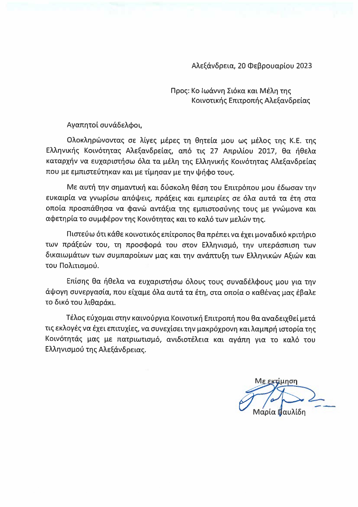 Μαρίας Παυλίδη εΠΙΣΤΟΛΗ