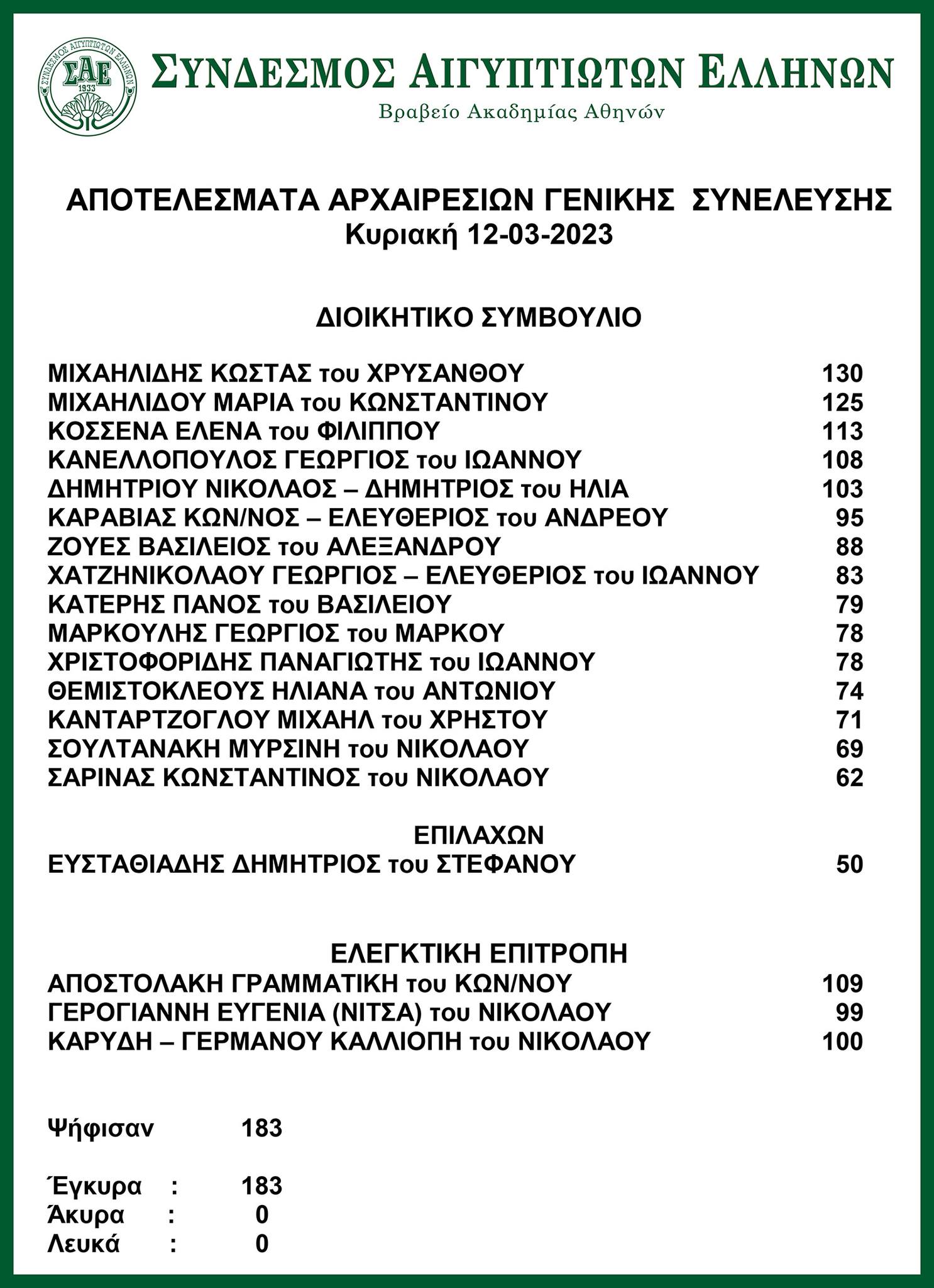 Ο ιστορικός Σύνδεσμος Αιγυπτιωτών Ελλάδος, πραγματοποίησε τις εκλογές του και σας παραθέτουμε τα αποτελέσματα της ετυμηγορίας των μελών του. Καλή επιτυχία στο έργο των νεοεκλεγέντων, δύναμη και αντοχή για την επίτευξη των στόχων του ΣΑΕ.
