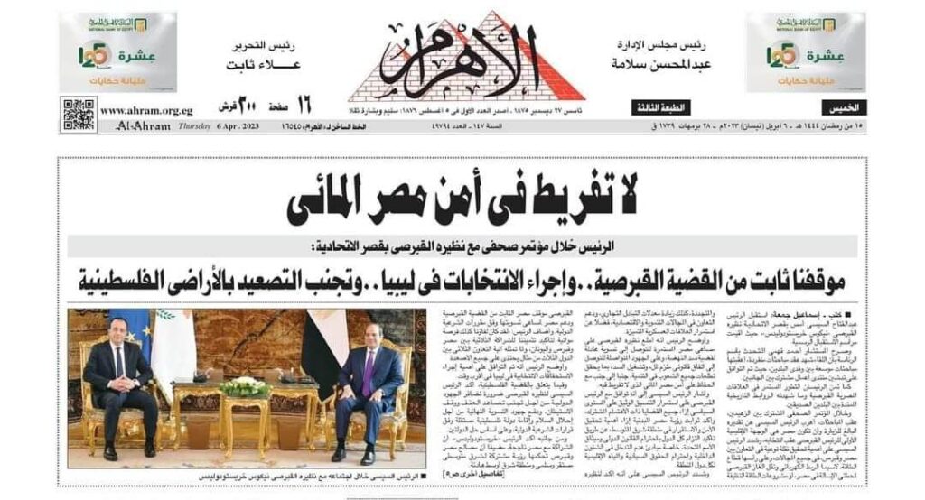“Σημείωση: Η εφημερίδα Αλ Αχράμ έγραψε επιγραμματικά: “Σταθερή η θέση της Αιγύπτου στο Κυπριακό… Εκλογές στην Λιβύη… Αποκλιμάκωση στα Παλαιστινιακά εδάφη “