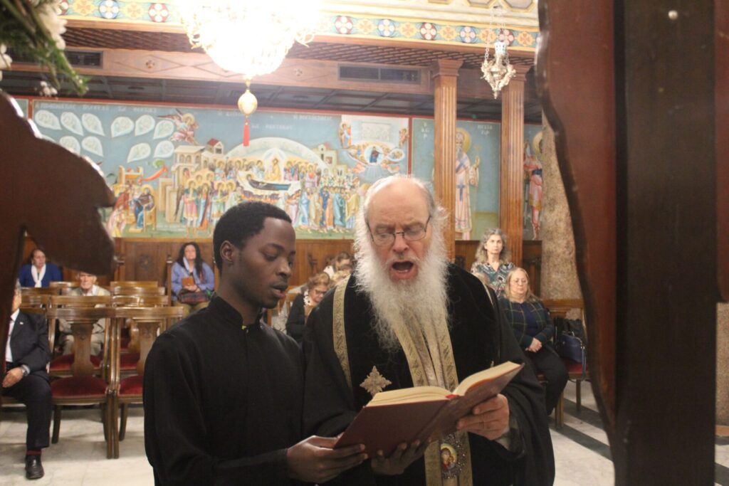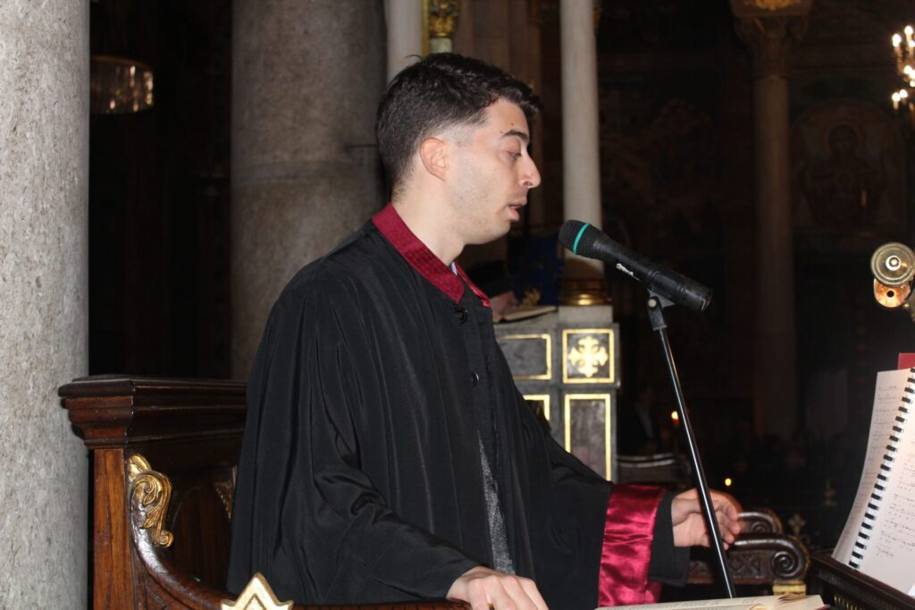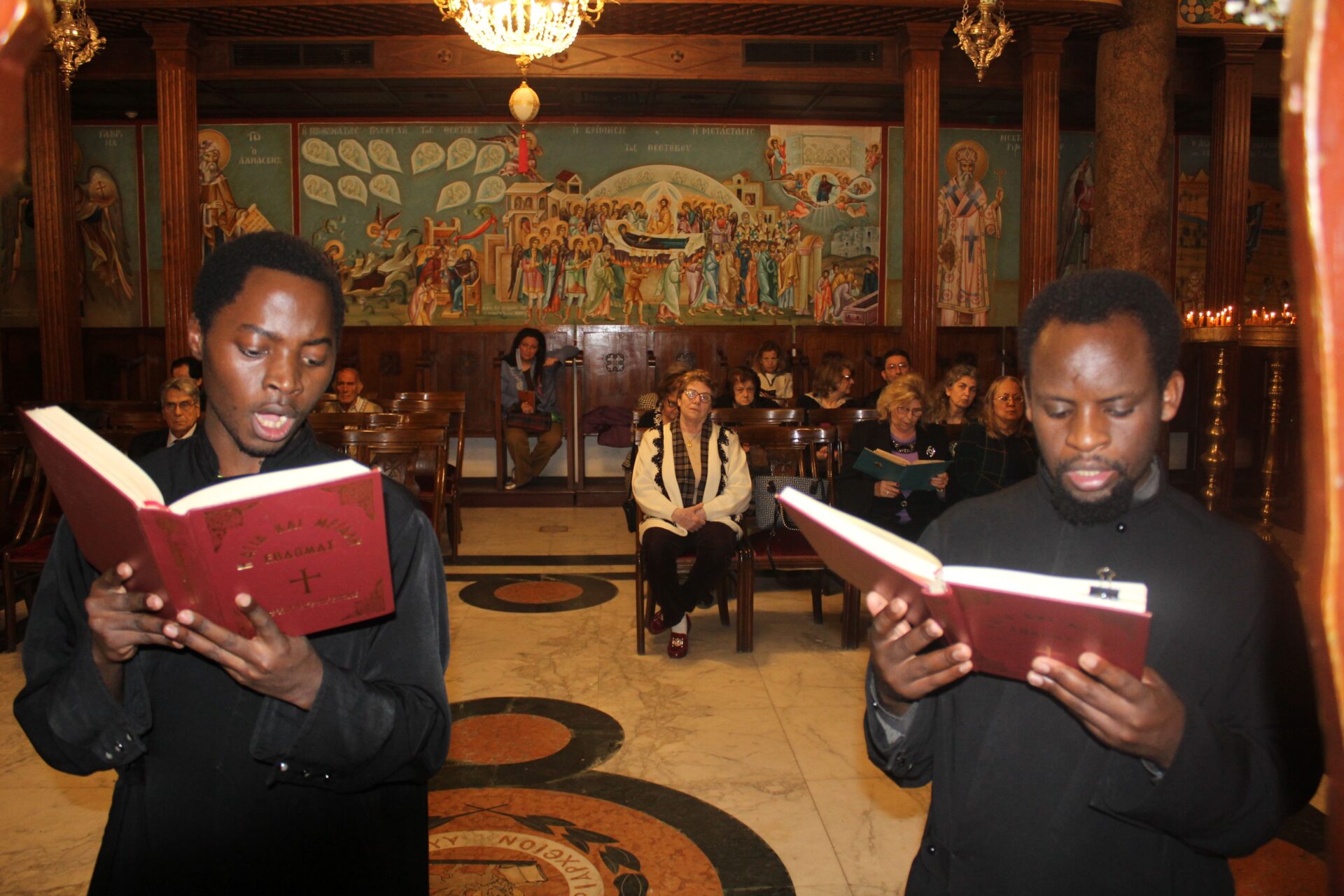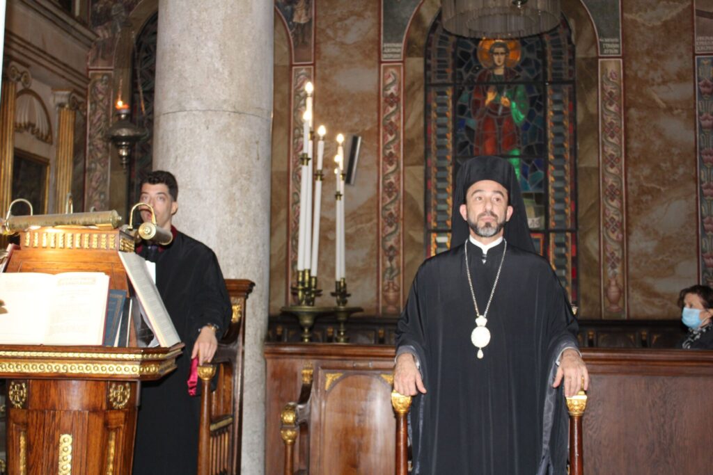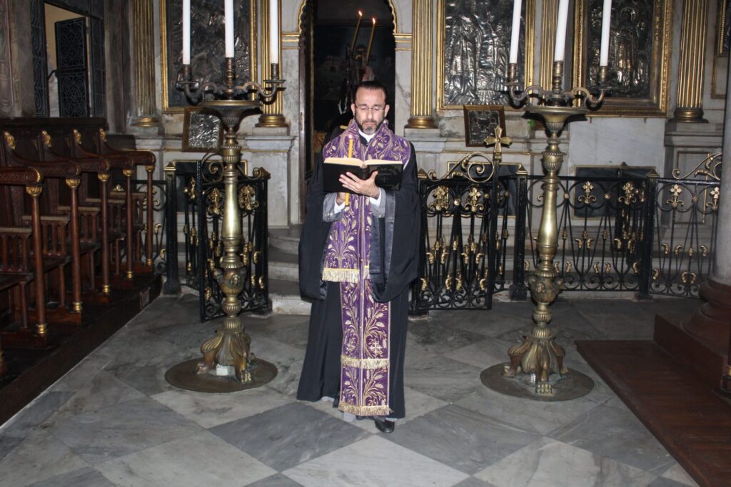 Ο Μακαριώτατος με τη θλίψη στα μάτια, μετά την ανάγνωση του Πρώτου Ευαγγελίου, βιώνει την απεικόνιση του Θείου Δράματος, με εσώτερη προσευχή «παραδομένος» στην θεία αφήγηση των ιερών γεγονότων. Δίπλα του ο Σεβασμιότατος Μητροπολίτης Ναυκράτιδος κ. Παντελεήμων, Αρχιγραμματέας της Ιεράς Συνόδου, συμπροσεύχεται με την απόλυτη σιωπή της εκ βαθέων αναζήτησης. Ο Πανοσιολογιότατος Αρχιμανδρίτης και Σχολάρχης της Πατριαρχικής Ιερατικής Σχολής κ. Ισαάκ, τελεί τα καθήκοντα της Θείας Ακολουθίας ενώ οι μαθητές του, ζουν κι αυτοί την Μεγάλη Πέμπτη μέσα από τα αναγνώσματα των Ευαγγελίων, τα οποία άπαντες πλην του Μακαριωτάτου, εναλλάσσονται στην εξιστόρηση. Όσο για τον άρτι αφιχθέντα ιεροψάλτη Κωνσταντίνο Παπαγγέλη, η χαρισματική φωνή του ανεβάζει τον πήχη της βυζαντινής μουσικότητας και υπερασπίζεται το ψαλτήριο του Καθεδρικού Ναού του Ευαγγελισμού με την πολύχρονη παράδοση και ιστορία.