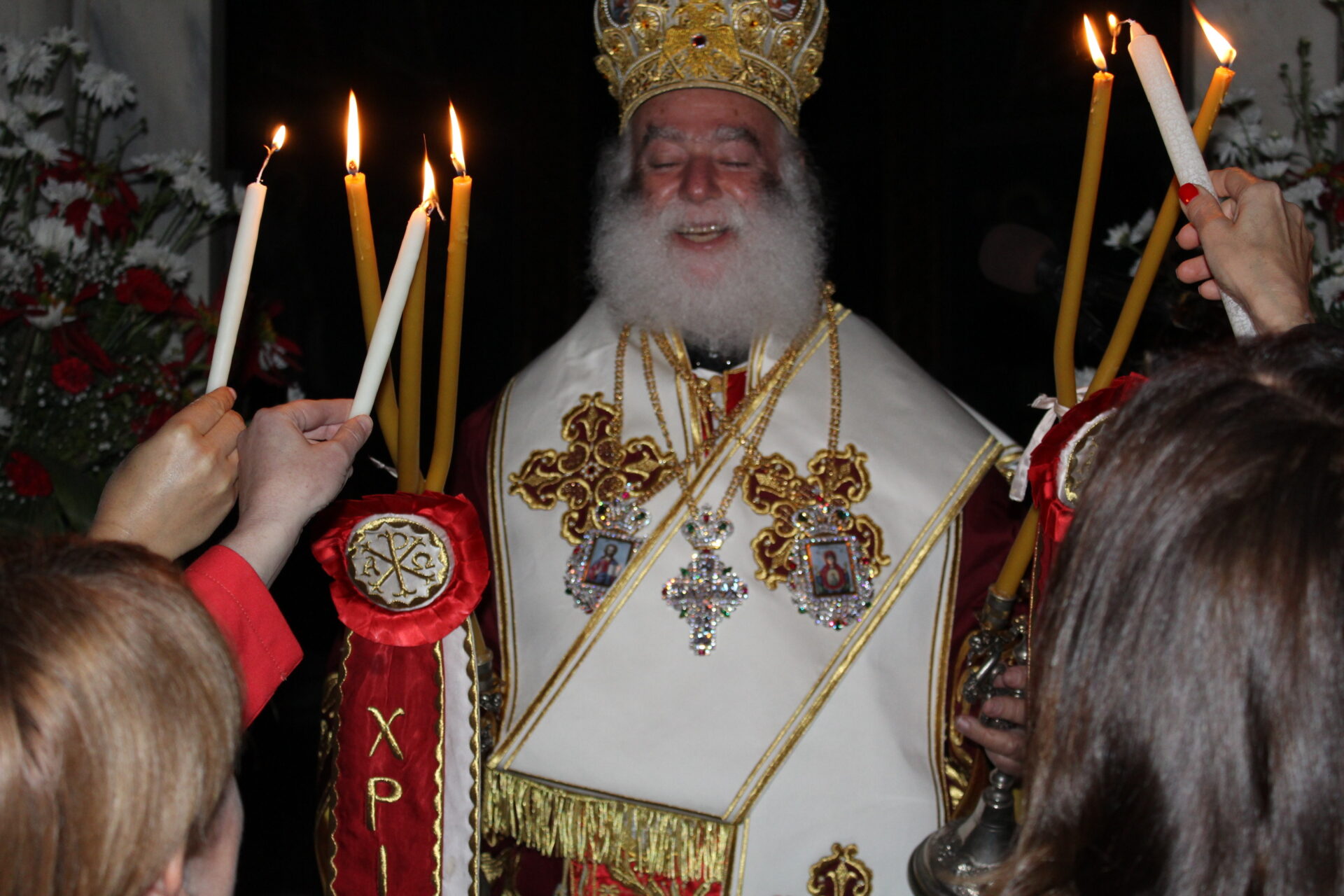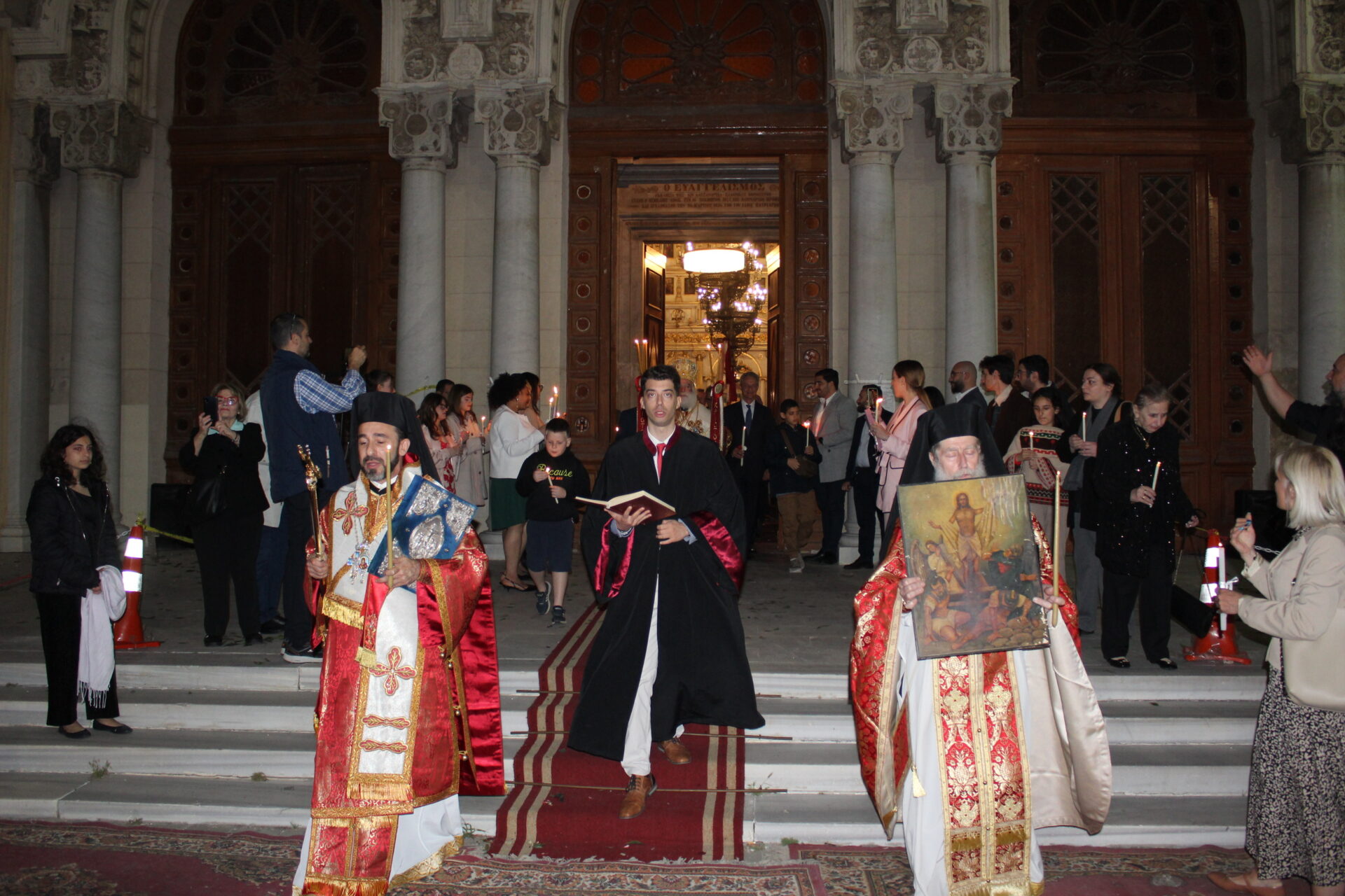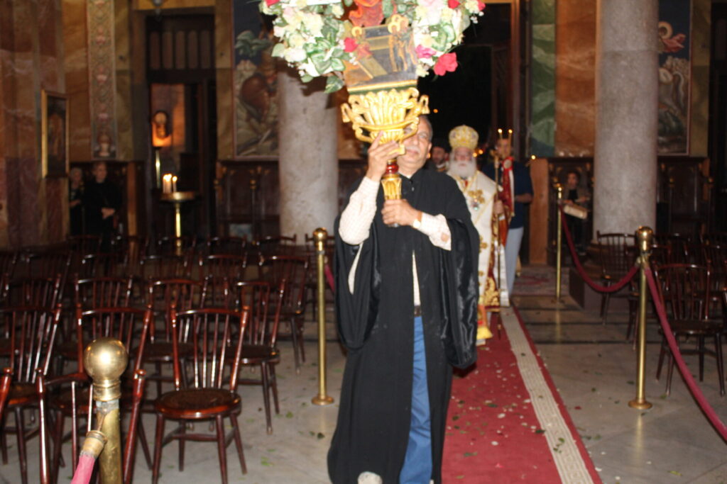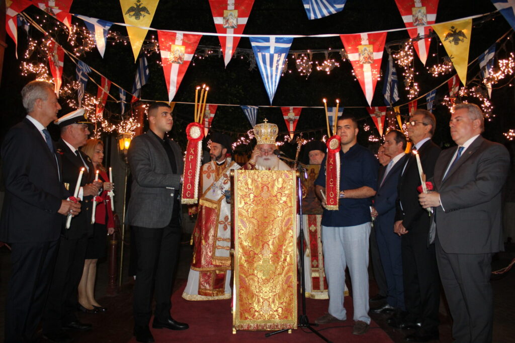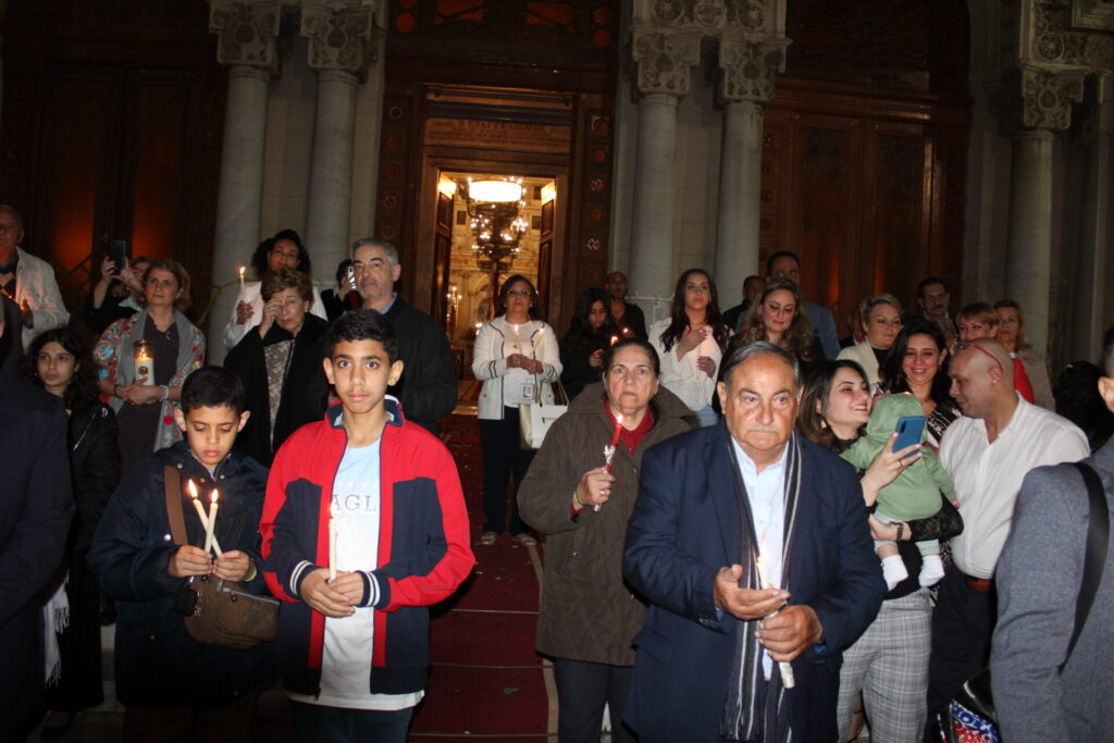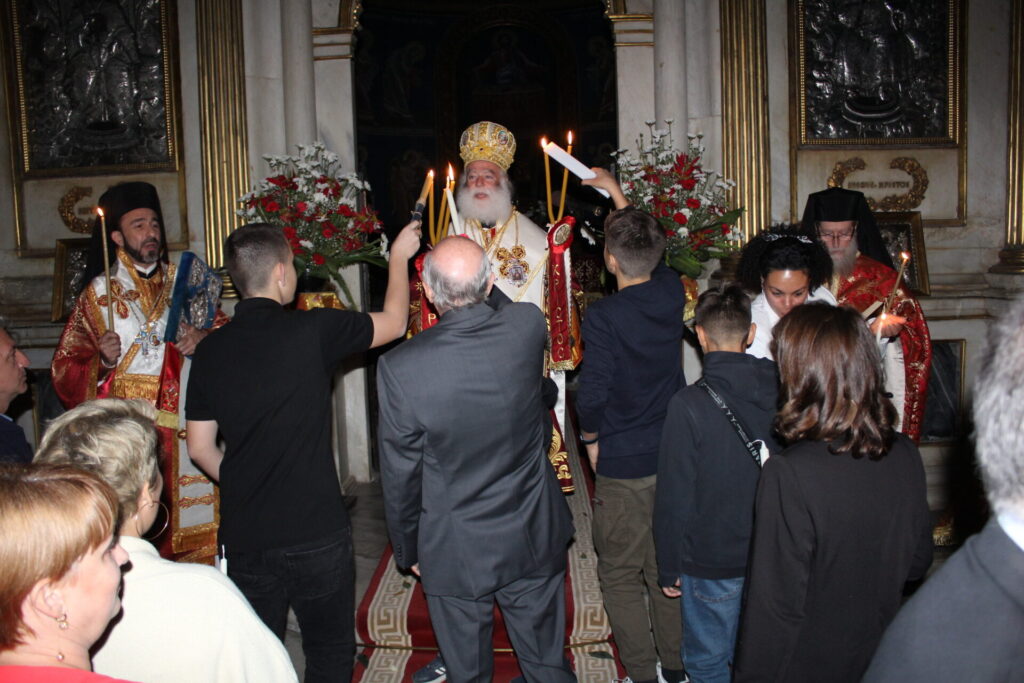 Η Α.Θ. Μακαριότης ο Πάπας και Πατριάρχης Αλεξανδρείας και πάσης Αφρικής κ.κ. Θεόδωρος Β΄, βγήκε από την Ωραία Πύλη, μια εικόνα κατανυκτική καθώς το Άγιο Φως φώτιζε ολάκερο το πρόσωπό του και απευθυνόμενος στους πιστούς αναφώνησε «Δεύτε Λάβετε Φως». Έδωσε το Άγιο Φως στο ποίμνιο που ανέμενε εναγωνίως τη στιγμή αυτή και συνοδευόμενος από τον Σεβασμιώτατο Μητροπολίτη Ναυκράτιδος κ. Παντελεήμων, Αρχιγραμματέα της Ιεράς Συνόδου και τον Πανοσιολογιότατο Αρχιμανδρίτη και Σχολάρχη της Ιερατικής Σχολής κ. Ισαάκ, ανέβηκαν μαζί στην εξέδρα που είχε στηθεί όπως κάθε χρόνο στον προαύλιο χώρο. Ο Μακαριώτατος πλαισιωμένος από τον Γενικό Πρόξενο – Πρέσβυ, κ. Αθανάσιο Κοτσιώνη, τον Πρόεδρο της Ελληνικής Κοινότητας Αλεξανδρείας κ. Ανδρέα Βαφειάδη, τον Πλοίαρχο και Σύνδεσμο του Πολεμικού Ναυτικού κ. Κωνσταντίνο Βαρουξή, τον Α΄ Αντιπρόεδρο της ΕΚΑ κ. Ιωάννη Παπαδόπουλο, την Πρόεδρο του ΕΝΟΑ και του Πτολεμαίου κα. Λιλίκα Θλιβίτου, τον Οικονομικό Επόπτη κ. Εμμανουήλ Τατάκη, τον Κοινοτικό Επίτροπο κ. Βασίλειο Ζουέ και τον κ. Ευάγγελο Νεαμονίτη Αναπληρωτή Οικονομικού Επόπτη, έψαλλαν το Χριστός Ανέστη με την προτροπή του Πατριάρχη μαζί με το πλήθος των Παροίκων της Αλεξάνδρειας. Παρόντες κάτω από την ΕΚΑ ο Γενικός Γραμματέας κ. Νικόλας Κατσιμπρής και ο διευθυντής κ. Γεώργιος Μπούλος. Παρούσα όπως πάντα, η σύζυγος του Γ. Προξένου – Πρέσβυ, κ. Αθανάσιου Κοτσιώνη, Ιωάννα, ενώ από την Κοινότητα Καίρου παρούσα ήταν η κα. Βίλλυ Πολίτη.