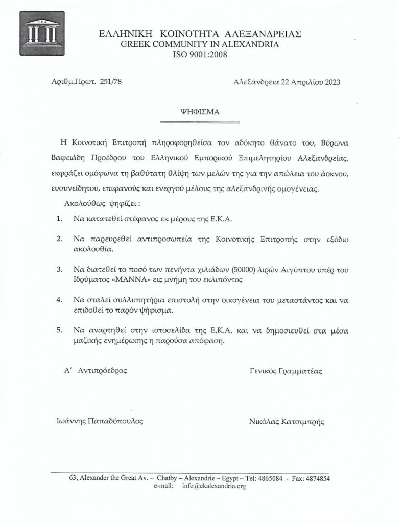 Η τραγική είδηση της αιφνίδιας απώλειας, του επιφανούς και αξιαγάπητου σε όλη την Παροικία, Βύρωνα Βαφειάδη, συγκλόνισε και βύθισε στο πένθος την αλεξανδρινή ομογένεια. Ο εκλιπών υπήρξε μια σπουδαία προσωπικότητα, που διήγε τη ζωή του, με ήθος, εντιμότητα, ευπρέπεια και ενσυναίσθηση για τους συνανθρώπους του και κυρίως για τους συμπαροίκους του.