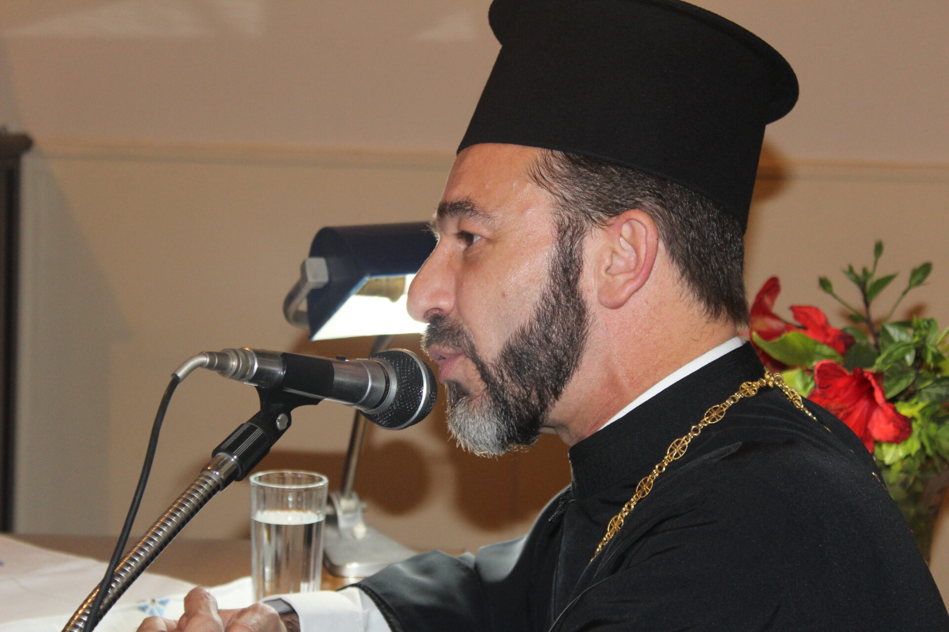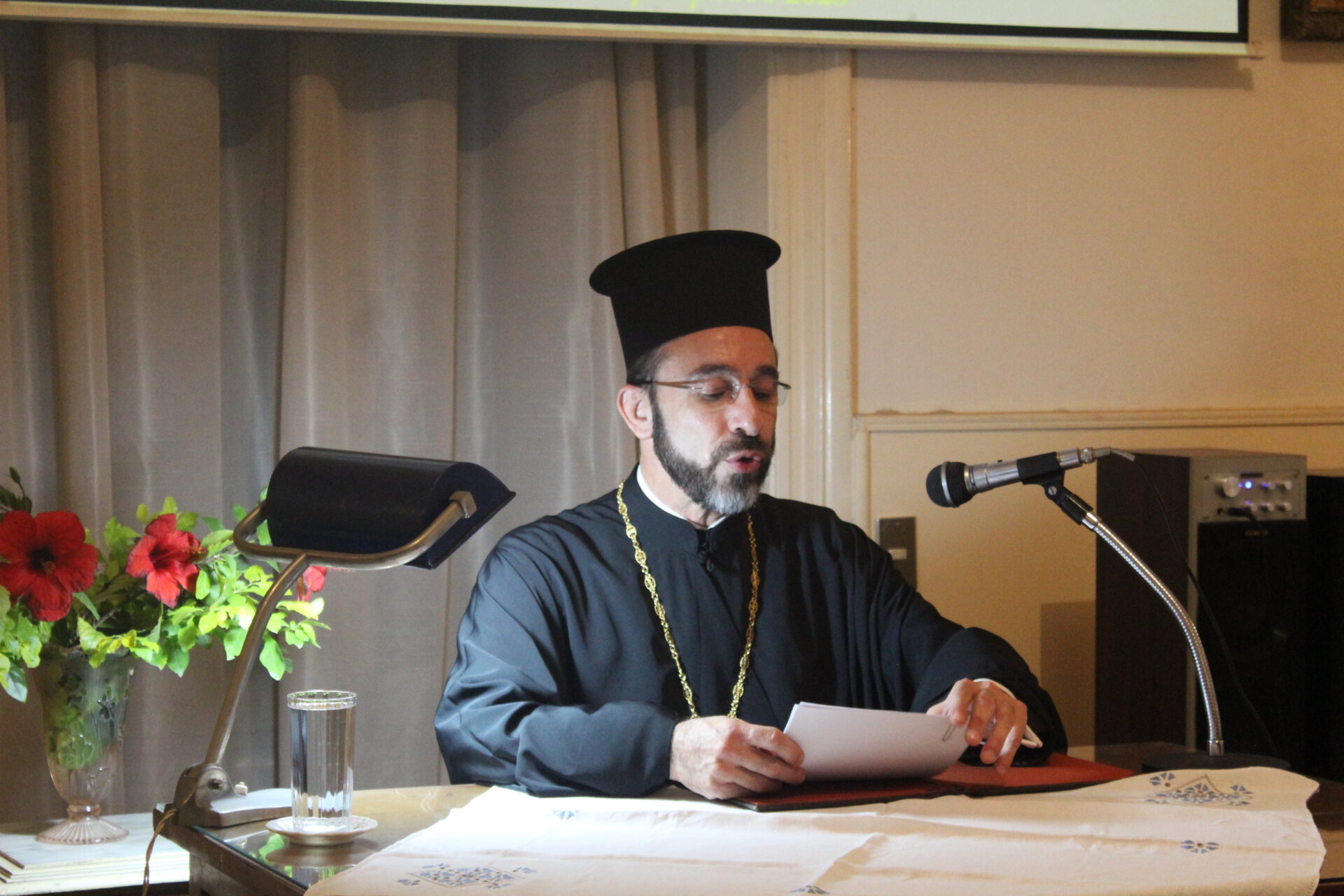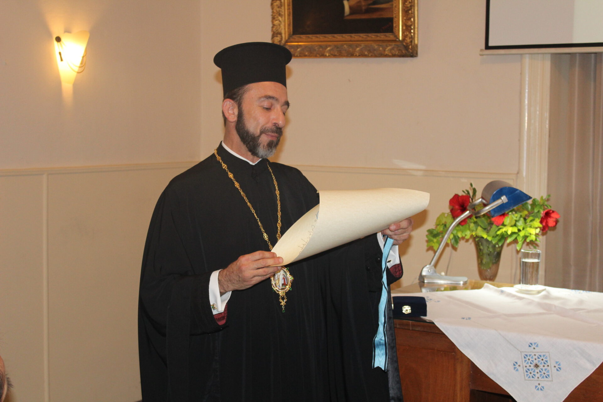 Ακολούθως έκανε αναφορά στον επίσημο ομιλητή Σεβασμιώτατο Μητροπολίτη Ναυκράτιδος, κ. Παντελεήμωνα, Υπέρτιμο Αρχιγραμματέα της Ιεράς Συνόδου του Παλαιφάτου Ορθοδόξου Χριστιανικοῦ Πατριαρχείου τῆς Μεγάλης Πόλεως της Αλεξανδρείας, Αιγύπτου και πάσης Αφρικής. Ανέφερε λοιπόν: «Ο Σεβασμιώτατος γεννήθηκε στην ιερά νήσο Τήνο το 1974. Είναι πτυχιούχος του Τμήματος Θεολογίας, από την Θεολογική  Σχολή του Πανεπιστημίου Αθηνών και απόφοιτος του Γαλλικού Ινστιτούτου Αθηνών. Ομιλεί την Αγγλική, Γαλλική και Ιταλική γλώσσα. Χειροτονήθηκε Διάκονος το 2000 και Πρεσβύτερος-Αρχιμανδρίτης το 2001 από τον μακαριστό Μητροπολίτη Σύρου κυρό Δωρόθεο A’., και επὶ Δωροθέου Β΄ διακόνησε ως Ιεροκήρυξ και Διευθυντής Υπηρεσιών της Ιεράς Μητροπόλεως Σύρου. Τον Σεπτέμβριο του 2006, μετακλήθηκε στο Πατριαρχείο Αλεξανδρείας όπου διαδοχικώς ορίσθηκε: Διευθυντής Αναπτυξιακών Έργων, Κωδικογράφος της Ιεράς Συνόδου, Διευθυντής του Ιδιαιτέρου Πατριαρχικού Γραφείου και Αρχιγραμματεύς της Αγίας και Ιεράς Συνόδου και Μέλος της Πατριαρχικής Επιτροπής Ευρωπαϊκών Θεμάτων. Έχει συνοδεύσει τον Μακαριώτατο Πάπα και Πατριάρχη σε επίσημες επισκέψεις και  ιεραποστολικές  οδοιπορίες.