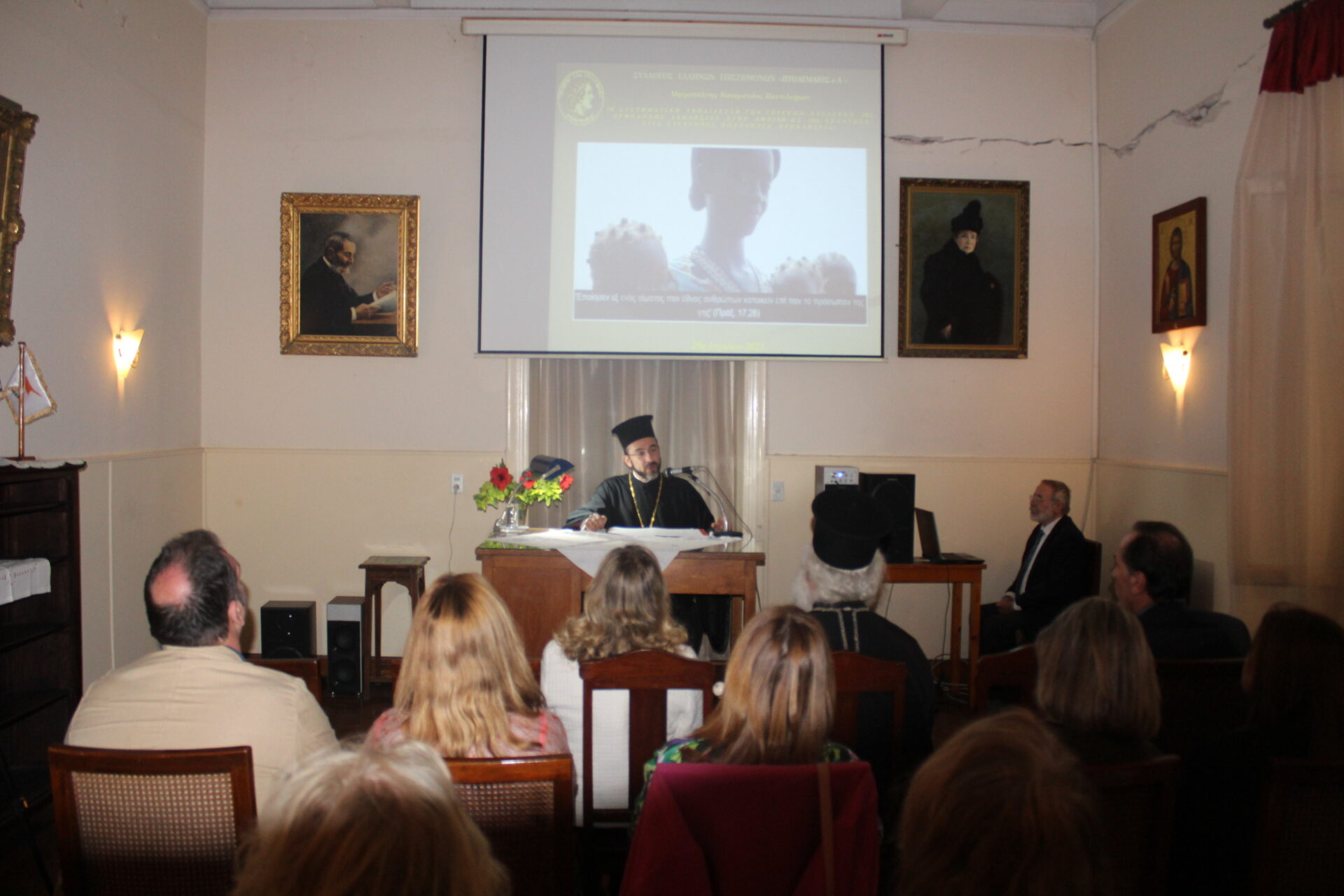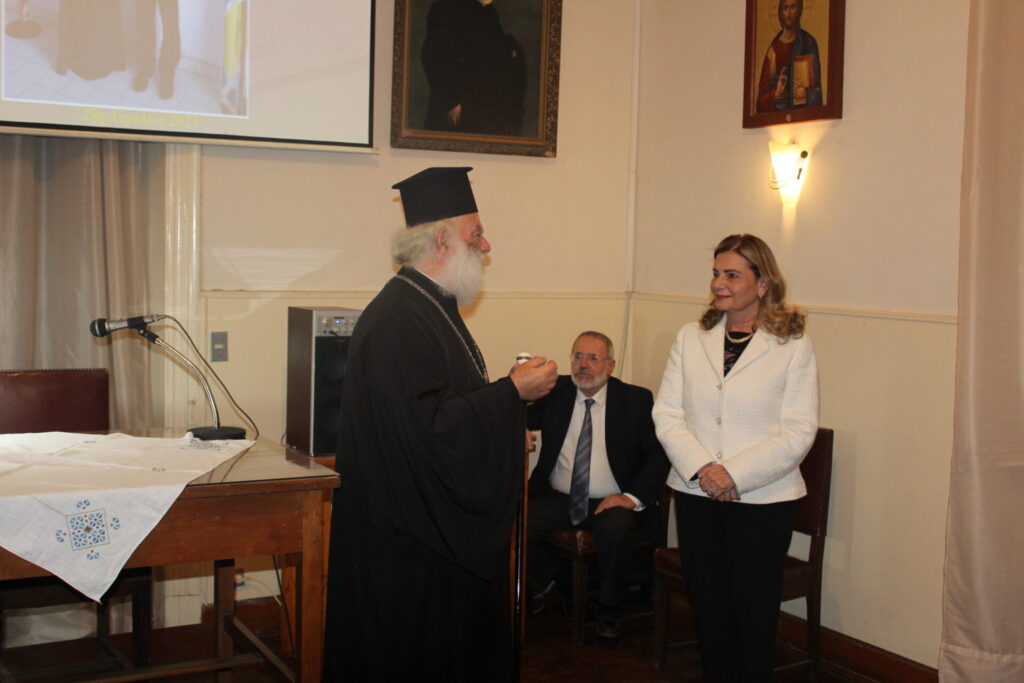 Μόλις ολοκλήρωσε το λόγο της κ κα. Θλιβίτου, ανέλαβε να μας διαφωτίσει ο ομιλητής, ο οποίος μεταξύ πολλών άλλων είπε τα εξής: «Η διδασκαλία της Ορθοδόξου πίστεως, εκφρασθείσα στο διάβα των αιώνων κυρίως μέσα από την –με την ευρύτερη έννοια των όρων- ελληνική φιλοσοφική σκέψη και παρακαταθήκη των προ Χριστού φιλοσόφων με κυριώτερη την Πλατωνική και μεταπλατωνική σκέψη και θεώρηση, σε συνδυασμό με τον πλούτο της ελληνικής γλώσσας, που υπήρξε ο κατεξοχήν φορέας έκφρασης των θεολογικών εννοιών ανά τους αιώνες (π.χ. αιών, λόγος, ων, μη ων, επέκεινα κλπ), αποτελεί τον κυριώτερο, κατά την ταπεινή μου άποψη, παράγοντα στον οποίο η Εκκλησία μας προσπαθεί σήμερα να εργασθεί, ώστε τα ζείδωρα νάματα της πίστεως να εμπεδωθούν από τους Αφρικανούς αδελφούς, οι οποίοι όμως στερούνται αναλόγου γνώσεως, αλλά και δυνατότητος γλωσσικής εκφράσεως….]