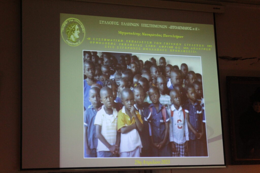 Μία ιδιαίτερα σημαντική και ωφέλιμη προς όλους, διάλεξη, πραγματοποίησε ο Σεβασμιότατος Μητροπολίτης Ναυκράτιδος κ. Παντελεήμων, Αρχιγραμματέας της Ιεράς Συνόδου, στον Σύλλογο Επιστημόνων Πτολεμαίος Α΄. Το θέμα που ανέπτυξε ο ομιλητής ήταν η «Συστηματική εκπαίδευση των γηγενών στελεχών της Ορθόδοξης Εκκλησίας στην Αφρική ως μια απάντηση στις σύγχρονες πολλαπλές προκλήσεις». Η αίθουσα του ιστορικού Συλλόγου γέμισε από Αιγυπτιώτες που θέλησαν να παρακολουθήσουν, μετά από πολύ καιρό, μια τόσο ενδιαφέρουσα ανάλυση για ένα ζήτημα που αφορά άμεσα την Ορθοδοξία στην Αφρική.