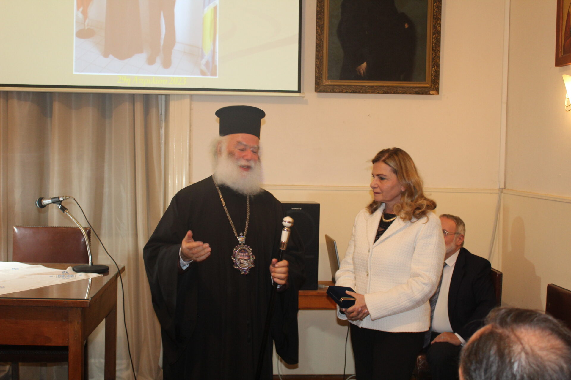 Ο Πατριάρχης Αλεξανδρείας κ. Θεόδωρος Β΄ τίμησε την όλη εκδήλωση με την παρουσία του, αλλά και με τον χαιρετισμό του που ήταν μια εξαιρετική αναφορά στο ιεραποστολικό  του έργο, όπου μέσα από αυτό, ένα μεγάλο μέρος των αφρικανικών λαών έχει βοηθηθεί τα μάλα. Η εμπεριστατωμένη τοποθέτηση του Πατριάρχη Αλεξανδρείας συγκίνησε το ακροατήριο και αποτέλεσε το προανάκρουσμα για την ομιλία του επίσημου ομιλητή. Στη συνέχεια η οικοδέσποινα και Πρόεδρος του Πτολεμαίου και του ΕΝΟΑ κα. Λιλίκα Θλιβίτου, ανέλαβε να μας διαφωτίσει για τον ομιλητή. Με ευγένεια ανεφέρθη στο βιογραφικό και το έργο του, το οποίο είναι εξόχως σημαντικό τόσο εν Αλεξανδρεία όσο και στο Κονγκό.