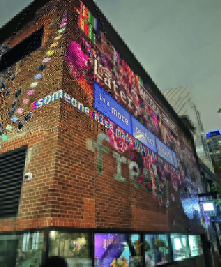 Τμήμα της εγκατάστασης που δημιούργησαν οι εικαστικοί καλλιτέχνες Νικ Κέιβ και Μπομπ Φάουστ για τον τοίχο του National Sawdust στο Μπρούκλιν. Φωτ.
