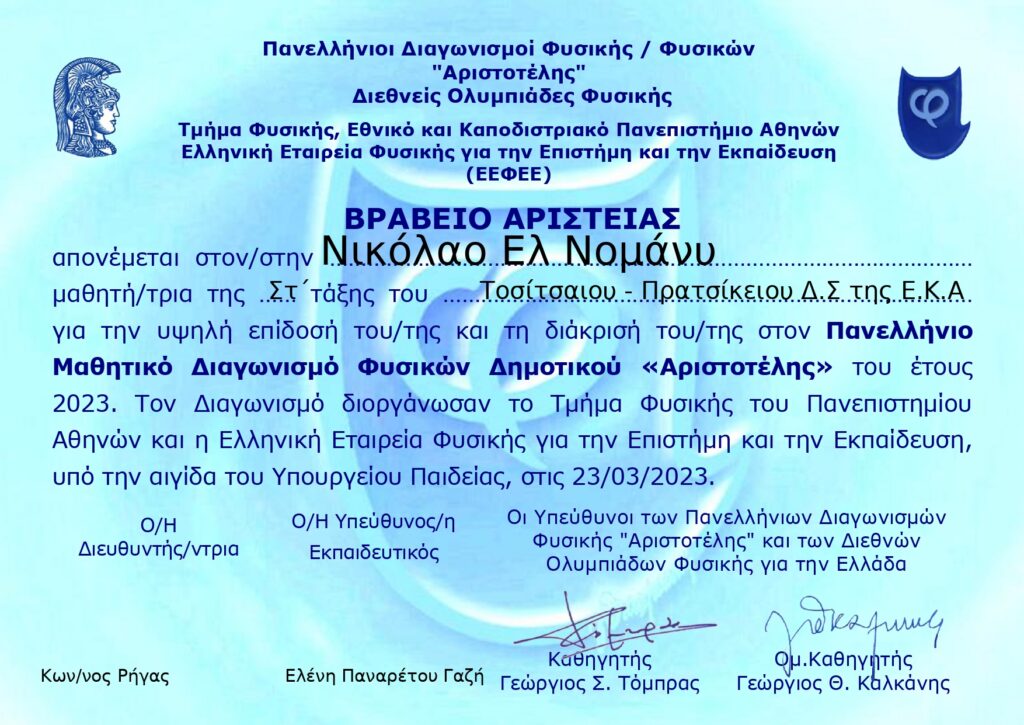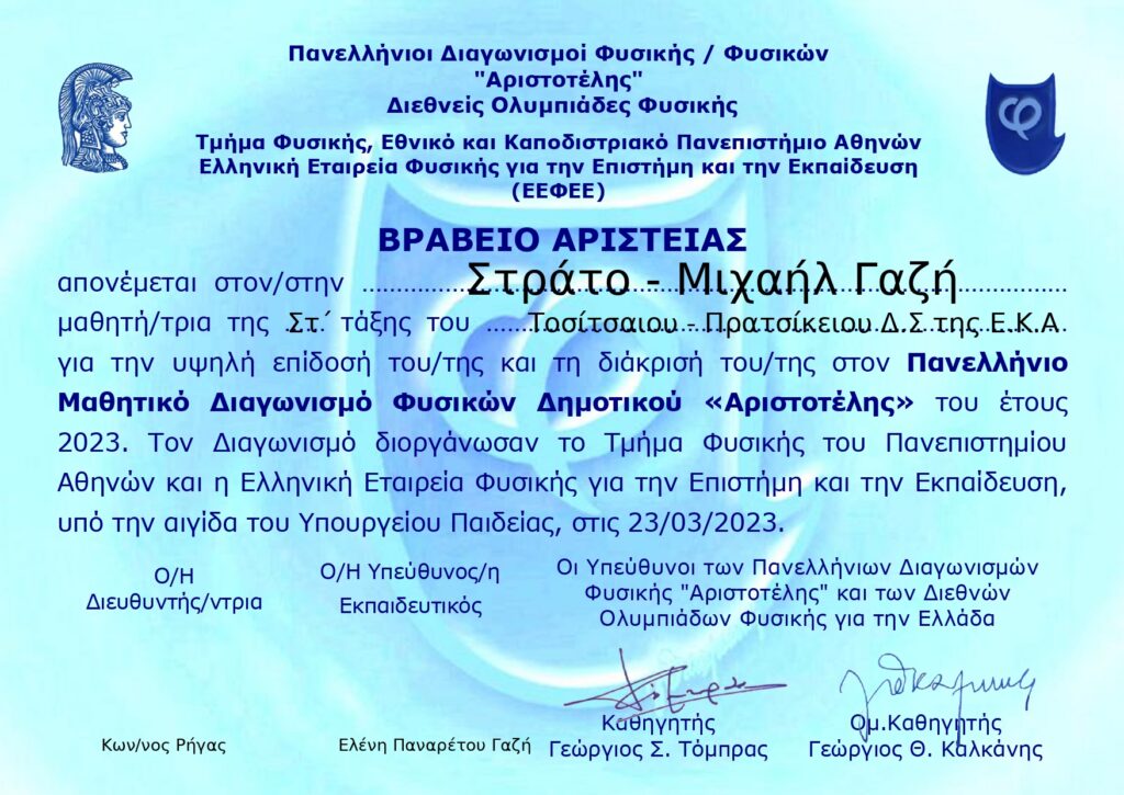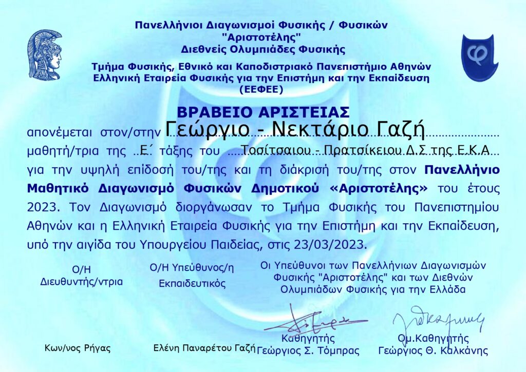 1) Στις 23 Μαρτίου 2023 πραγματοποιήθηκε ο Πανελλήνιος Μαθητικός Διαγωνισμός Φυσικών «Αριστοτέλης», που συνδιοργανώνουν σε ετήσια βάση το Τμήμα Φυσικής και το Εργαστήριο Φυσικών Επιστημών του Παιδαγωγικού Τμήματος Δ.Ε. του Πανεπιστημίου Αθηνών. Με την παρότρυνση και εμψύχωση της δασκάλας που διδάσκει Φυσική στις Ε και Στ τάξεις κ. Ελένης Παναρέτου Γαζή, στον διαγωνισμό αυτό συμμετείχαν για πρώτη φορά μαθητές του σχολείου μας. Ένας μαθητής μας από την Ε’ Δημοτικού, ο Γεώργιος Νεκτάριος Γαζής, και 2 μαθητές από την Στ τάξη, ο Στράτος Μιχαήλ Γαζής και ο Νικόλας Ελ Νομάνυ, κατόρθωσαν να διακριθούν σε πανελλαδικό επίπεδο μεταξύ χιλιάδων άλλων μαθητών! Και οι τρεις τους έλαβαν Βραβεία Αριστείας σύμφωνα με τους κανονισμούς του διαγωνισμού. Όμως, διακρίθηκαν και 3 ακόμη μαθητές με Εύφημη Μνεία, ο Αμίρ Πετράκης, ο Μπιλάλ Σαλάχ και ο Μίνα Μόρκο.