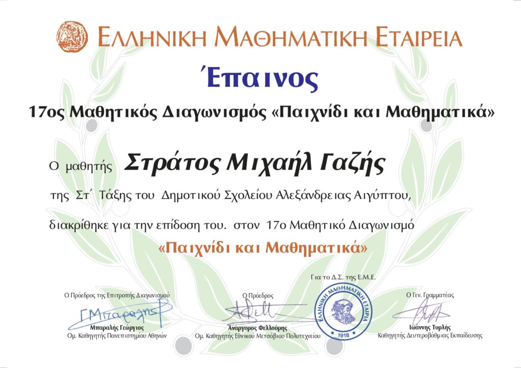 Από την Ε τάξη Έπαινο Διάκρισης παίρνει ο Γεώργιος Νεκτάριος Γαζής με βαθμολογία 80% και από τη Στ τάξη ο Στράτος Μιχαήλ Γαζής με βαθμολογία 90%. Ευχαριστούμε πολύ και τον Μαθηματικό του Αβερωφείου Σχολείου κ. Παναγιώτη Θεοδώρου που διόρθωσε τα γραπτά των μαθητών και τα οποία στη συνέχεια στάλθηκαν στα Γραφεία της Ελληνικής Μαθηματικής Εταιρείας για έλεγχο και επικύρωση.