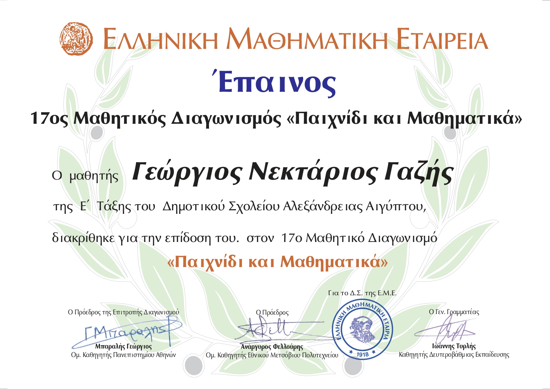 Από την Ε τάξη Έπαινο Διάκρισης παίρνει ο Γεώργιος Νεκτάριος Γαζής με βαθμολογία 80% και από τη Στ τάξη ο Στράτος Μιχαήλ Γαζής με βαθμολογία 90%. Ευχαριστούμε πολύ και τον Μαθηματικό του Αβερωφείου Σχολείου κ. Παναγιώτη Θεοδώρου που διόρθωσε τα γραπτά των μαθητών και τα οποία στη συνέχεια στάλθηκαν στα Γραφεία της Ελληνικής Μαθηματικής Εταιρείας για έλεγχο και επικύρωση.