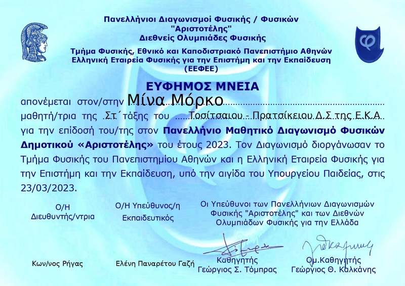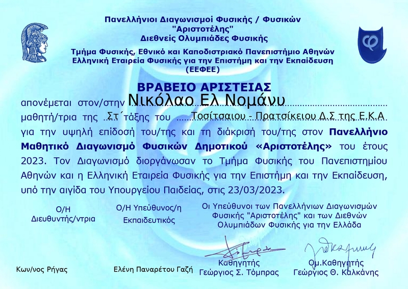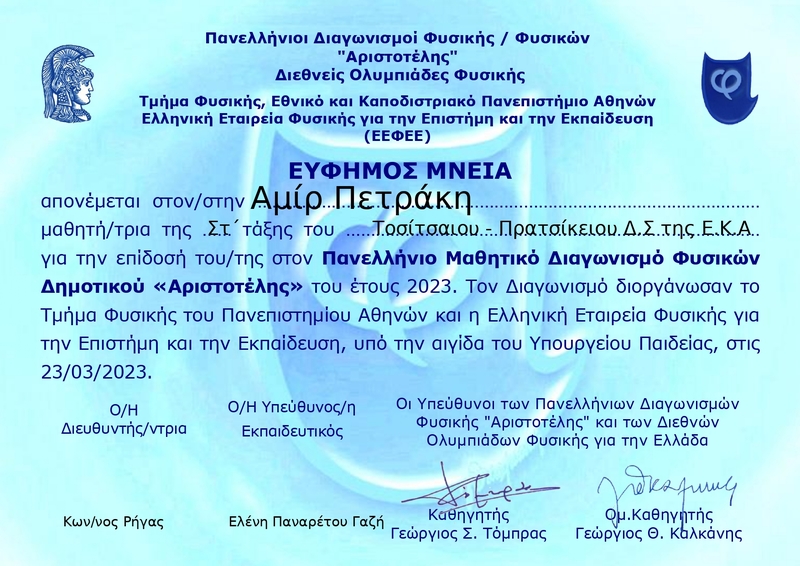 1) Στις 23 Μαρτίου 2023 πραγματοποιήθηκε ο Πανελλήνιος Μαθητικός Διαγωνισμός Φυσικών «Αριστοτέλης», που συνδιοργανώνουν σε ετήσια βάση το Τμήμα Φυσικής και το Εργαστήριο Φυσικών Επιστημών του Παιδαγωγικού Τμήματος Δ.Ε. του Πανεπιστημίου Αθηνών. Με την παρότρυνση και εμψύχωση της δασκάλας που διδάσκει Φυσική στις Ε και Στ τάξεις κ. Ελένης Παναρέτου Γαζή, στον διαγωνισμό αυτό συμμετείχαν για πρώτη φορά μαθητές του σχολείου μας. Ένας μαθητής μας από την Ε’ Δημοτικού, ο Γεώργιος Νεκτάριος Γαζής, και 2 μαθητές από την Στ τάξη, ο Στράτος Μιχαήλ Γαζής και ο Νικόλας Ελ Νομάνυ, κατόρθωσαν να διακριθούν σε πανελλαδικό επίπεδο μεταξύ χιλιάδων άλλων μαθητών! Και οι τρεις τους έλαβαν Βραβεία Αριστείας σύμφωνα με τους κανονισμούς του διαγωνισμού. Όμως, διακρίθηκαν και 3 ακόμη μαθητές με Εύφημη Μνεία, ο Αμίρ Πετράκης, ο Μπιλάλ Σαλάχ και ο Μίνα Μόρκο.