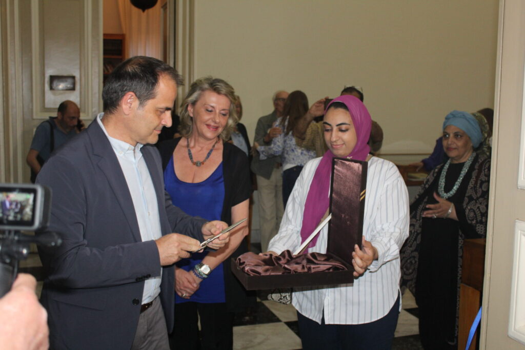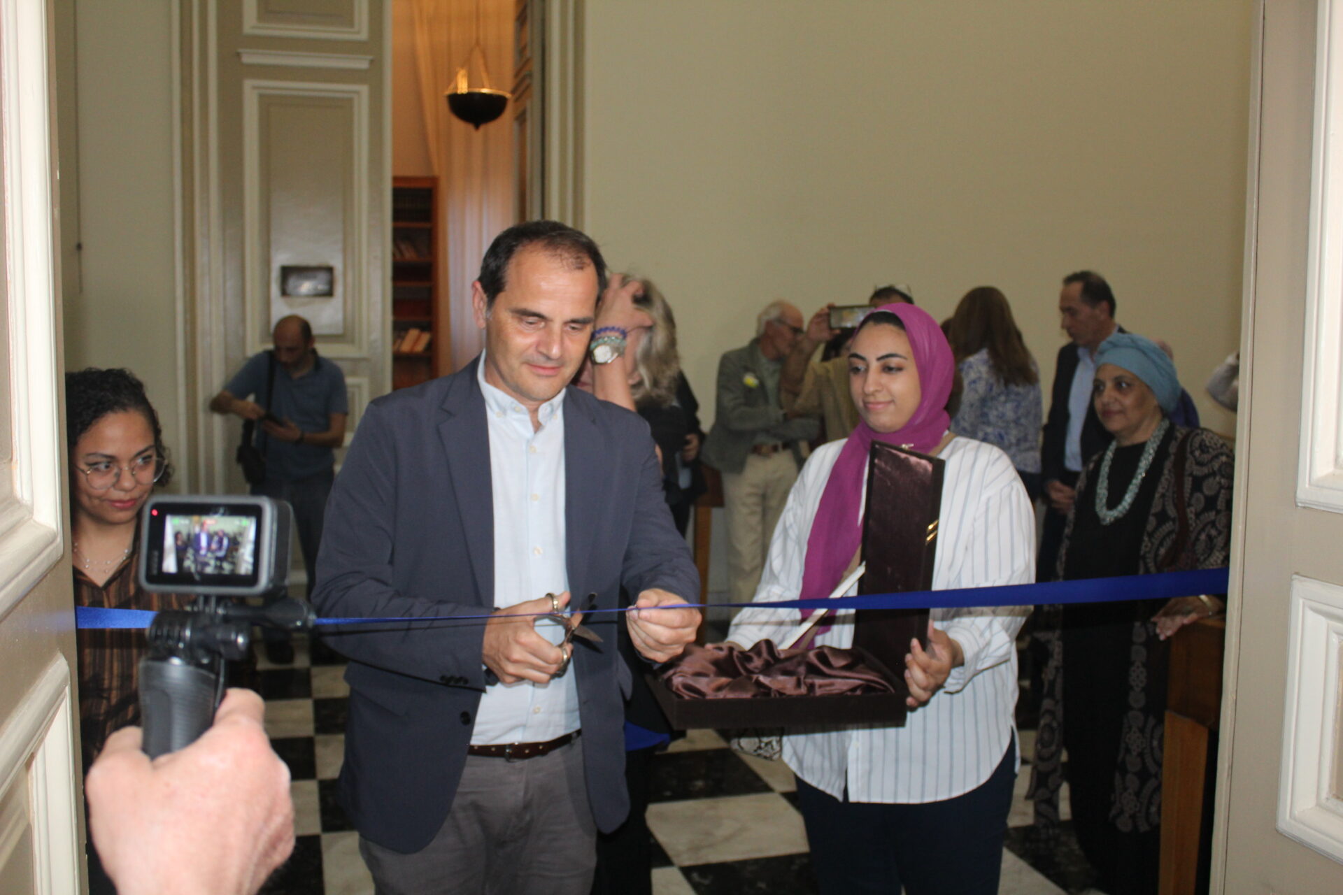 Κι όταν ολοκληρώθηκαν οι ομιλίες, η κα. Σπανούδη παρέδωσε στον Πρόεδρο της Ελληνικής Κοινότητας Αλεξανδρείας κ. Ανδρέα Βαφειάδη, το εθιμοτυπικό ψαλίδι για να κόψει την κορδέλα των εγκαινίων. Ένα χαρακτηριστικό πολιτιστικό ενσταντανέ, το συγκεκριμένο στιγμιότυπο, προσέδωσε την ανάλογη αίγλη στο όλο σκηνικό που καταχειροκροτήθηκε από τους παριστάμενους φίλους.