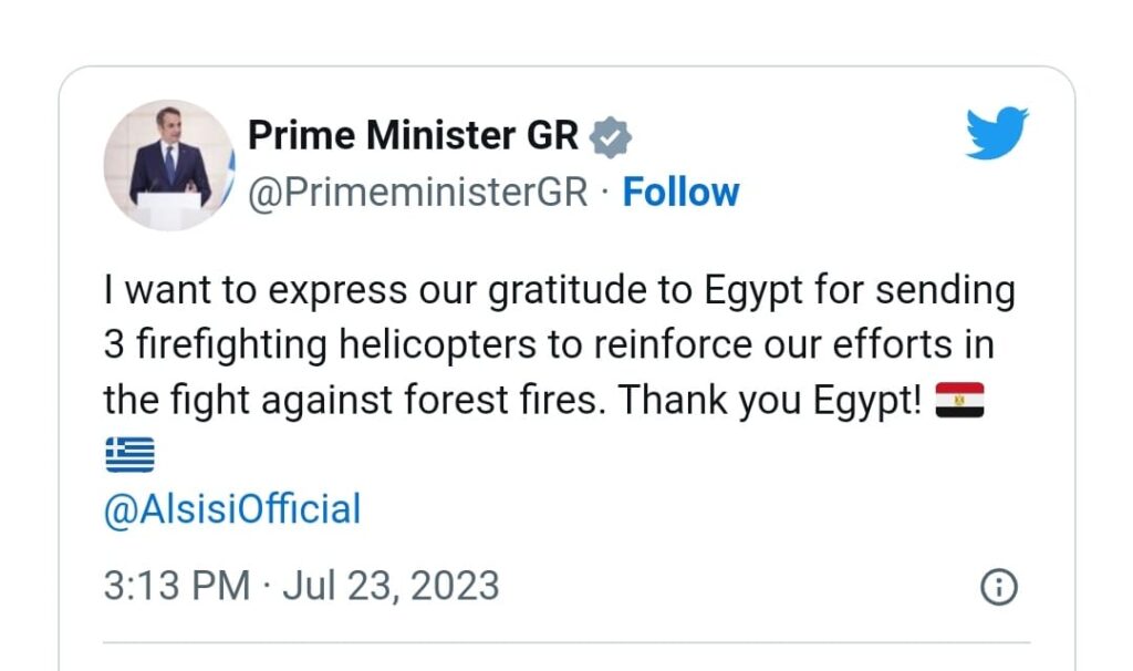 Ο πρωθυπουργός, Κυριάκος Μητσοτάκης με ανάρτησή του στο Twitter ευχαριστεί την Αίγυπτο για τη βοήθεια στην αντιμετώπιση των πυρκαγιών στην Ελλάδα με την κάτωθι διατύπωση: