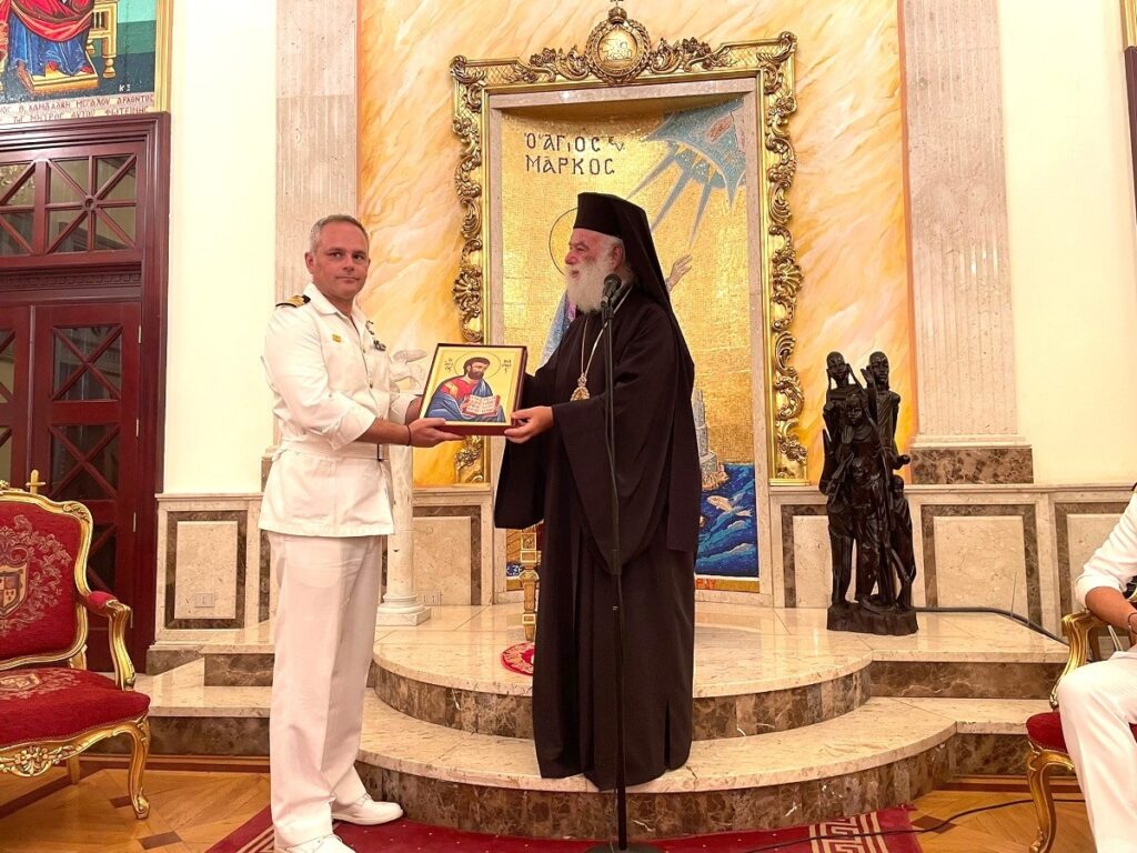 Από την πλευρά τους, ο επικεφαλής της ΣΜΥΝ, Πλοίαρχος Π.Ν. κ. Καστρινάκης και ο Κυβερνήτης του Α/Γ «Σάμος» Αντιπλοίαρχος Π.Ν. κ. Παναγόπουλος, εξέφρασαν την χαρά και την ευλογία, την οποία αισθάνθηκαν επισκεπτόμενοι την Πατριαρχική Καθέδρα, ενώ επήνεσαν την θυσιαστικώς και αθορύβως επιτελουμένη διακονία της Δευτεροθρόνου Εκκλησίας στην Αφρικανική ήπειρο, την οποία πάντοτε το Πολεμικό Ναυτικό θα τιμά και θα συνδράμει με τις δυνάμεις του. Ακολούθησε ανταλλαγή αναμνηστικών δώρων και περιήγηση στους χώρους του Πατριαρχικού Μεγάρου.
