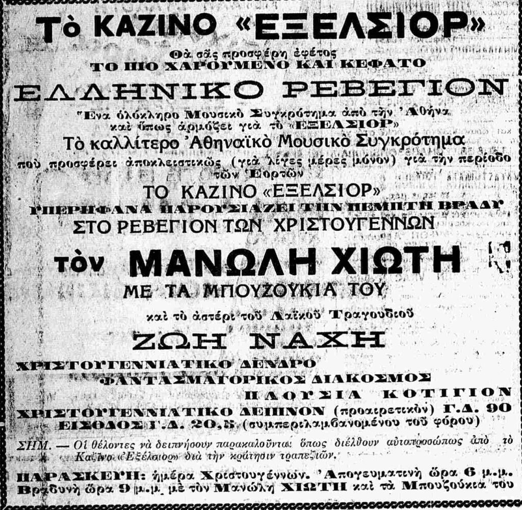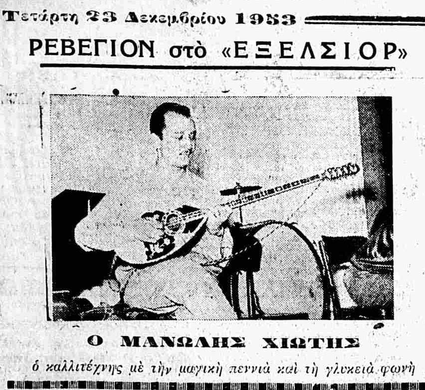 Έτσι στις 23 Δεκεμβρίου ο «Ταχυδρόμος» καταχωρεί φωτογραφία του Χιώτη αναγγέλοντας την παρουσία του στο καζίνο «ΕΞΕΛΣΙΟΡ». Στη λεγάντα διαβάζουμε για τον Μανώλη Χιώτη με τη μαγική πεννιά και τη γλυκειά φωνή. Από όσο μπορώ να δω ο Μ. Χιώτης κρατάει στα χέρια του τρίχορδο μπουζούκι.