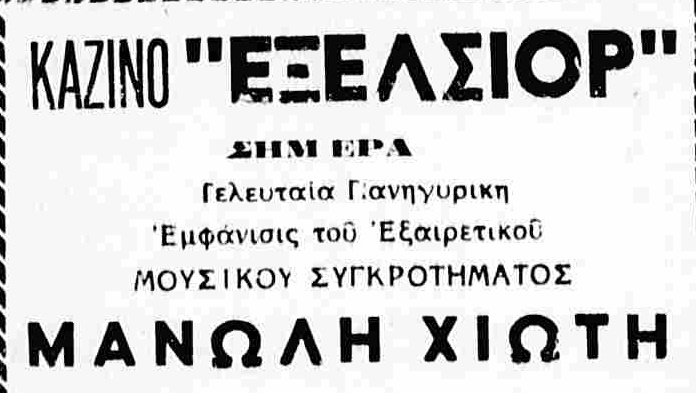 Η πρώτη διαφήμιση για τον Μανώλη Χιώτη μας έρχεται από τις 27 Δεκεμβρίου 1953. Το Καζίνο «ΕΞΕΛΣΙΟΡ» καταχωρεί διαφήμιση αποκλειστικά για τον Μ. Χιώτη.