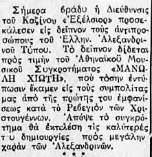 Παράλληλα όπως πληροφορούμαστε, η Διεύθυνση του Καζίνο παραχώρησε δείπνο στους αντιπροσώπους του ελληνικού τύπου της Αλεξάνδρειας, για να γνωρίσουν τον Μ. Χιώτη και το συγκρότημα του.