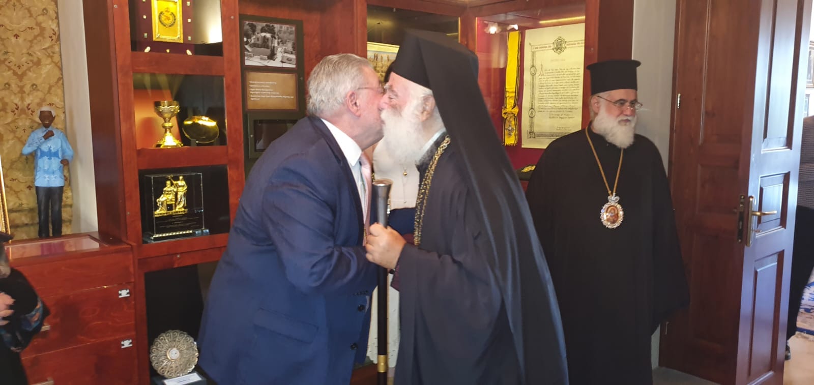 Ανταπέδωσε ο Ηγούμενος της Ιεράς Μονής με ένα εγκόλπιο στο οποίο αποτυπωνόταν ο Άγιος Κύριλλος, καθότι ο Μακαριώτατος ξεκίνησε την ιερατική του πορεία ως μοναχός, μέχρι που με αξιοσύνη και καθολική αποδοχή αναδείχθηκε ο αγαπημένος Πατριάρχης Αλεξανδρείας και Πάσης Αφρικής.