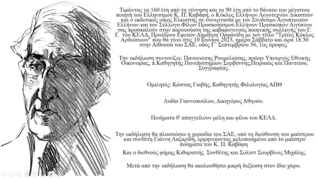 Διόλου τυχαία, η γνωριμία του με τους ανθρώπους και τον χώρο του Συνδέσμου Αιγυπτιωτών Ελλήνων στην Αθήνα, καθώς εκεί πραγματοποιήθηκε η παρουσία του βιβλίου του «Τρίτος Κύκλος Αρδεύσεων» την 10 Ιουνίου 2023, υπό την αιγίδα του προαναφερθέντος Συνδέσμου και του Συλλόγου Φίλων Προσκοπισμού Ελλήνων Προσκόπων Αιγύπτου, με εξαιρετική επιτυχία στο πλαίσιο της μνήμης του μεγάλου αλεξανδρινού για τα 160 χρόνια από τη γέννησή του και τα 80 απ΄ το θάνατό του.