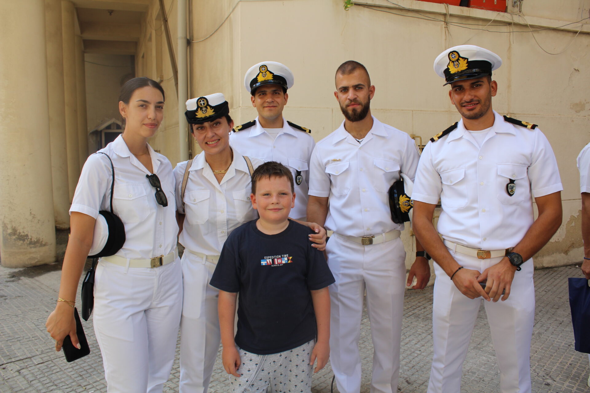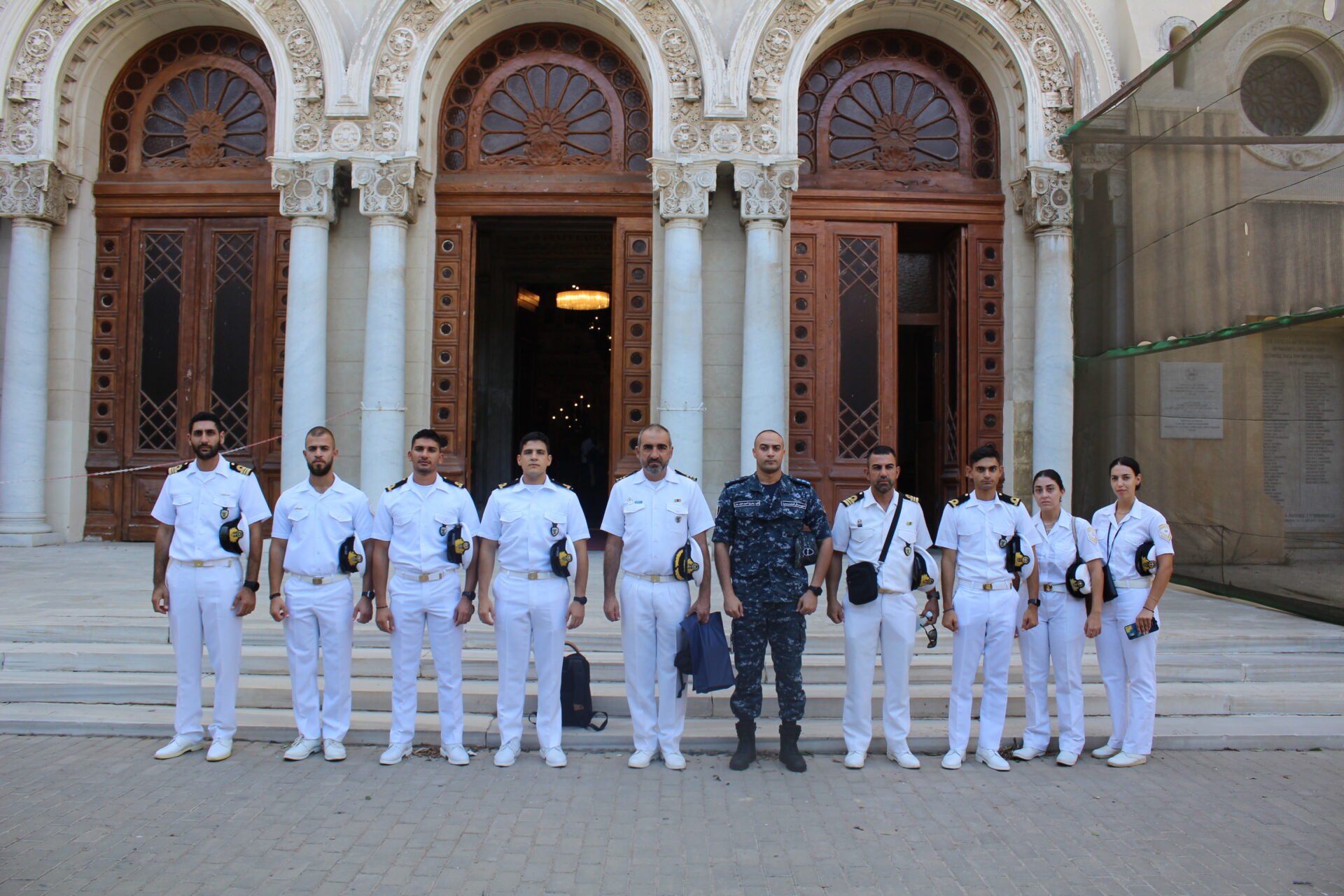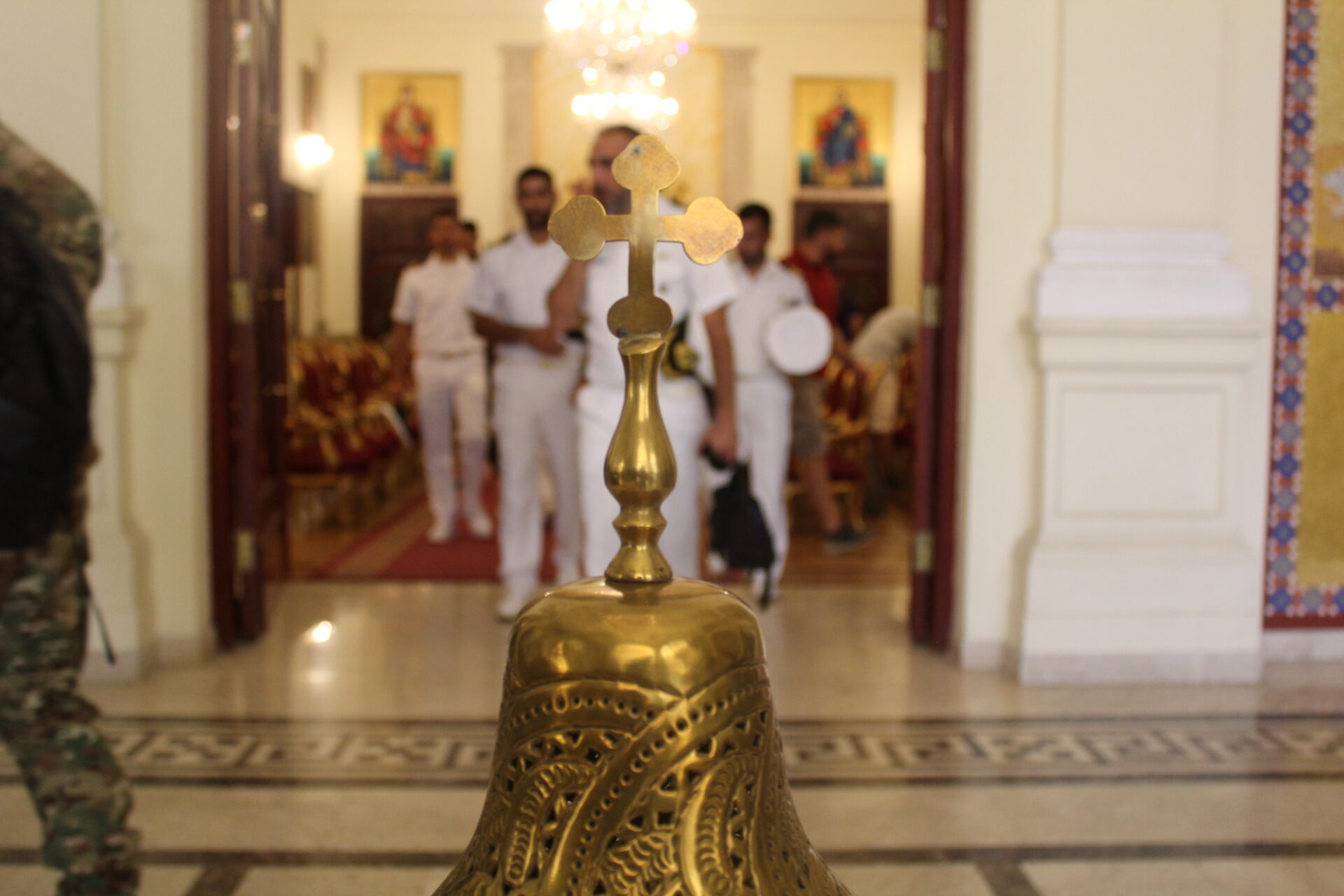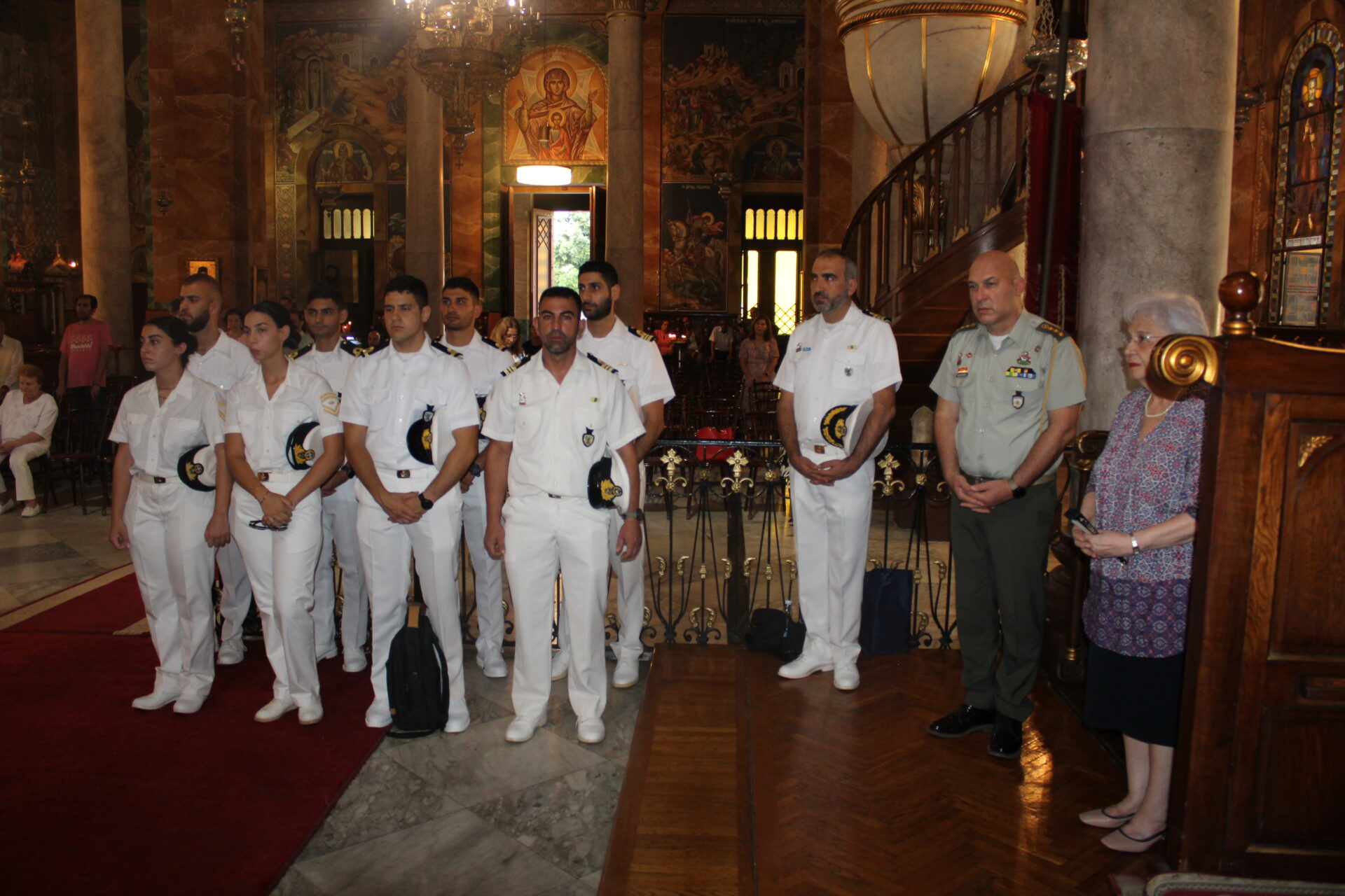 Δίπλα της ο Ακόλουθος Άμυνας της Κυπριακής Πρεσβείας στην Αίγυπτο, κ. Κωνσταντίνος Χατζηκωστής, ο κυβερνήτης του Πλοίου, Πλωτάρχης Γεώργιος Αριστοδήμου και ο επικεφαλής Ταγματάρχης Στέλλιος Κρασσάς. Επίσης, παρέστησαν πιστοί Αιγυπτιώτες και εκπαιδευτικοί από τα σχολεία της Ελληνικής Κοινότητας Αλεξανδρείας.