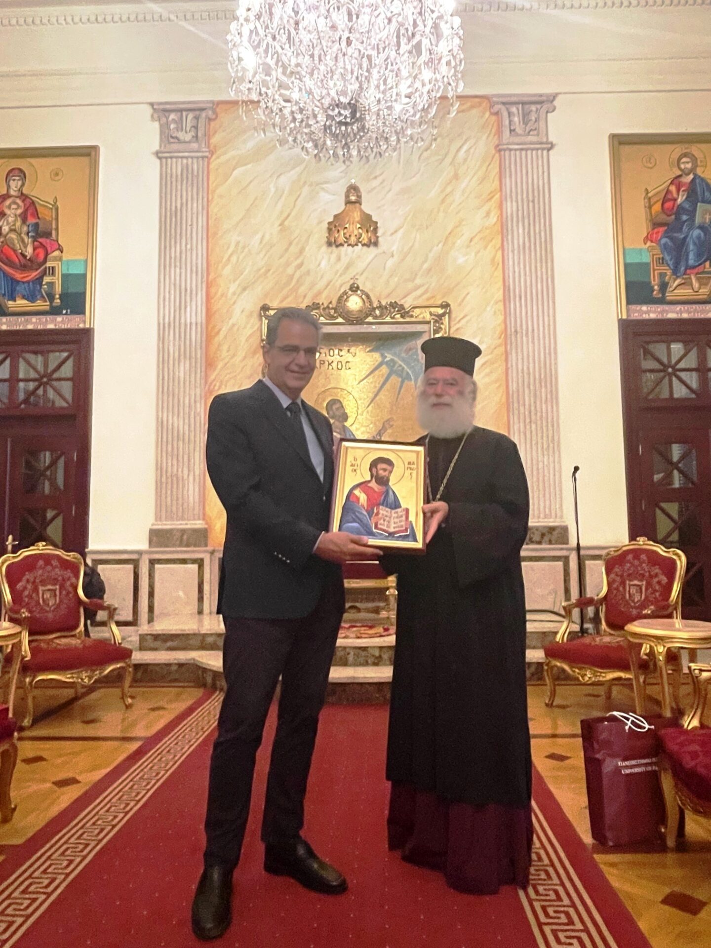 Την 23η Σεπτεμβρίου ε.ε. η ΑΘΜ ο Πάπας και Πατριάρχης Αλεξανδρείας και πάσης Αφρικής κ.κ. Θεόδωρος Β’ εδέχθη στην Πατριαρχική Καθέδρα την επίσκεψη αντιπροσωπείας του Πανεπιστημίου Πάτρων, αποτελουμένης από τον Πρύτανη, Ελλογιμ. Καθηγητή κ.Χρήστο Μπούρα, τον Αντιπρύτανη, Ελλογιμ. Καθηγητή κ.Διονύσιο Μαντζαβίνο και τον Γενικό Διευθυντή Οικονομικών Υποθέσεων και Φοιτητικής Μέριμνας κ.Χαράλαμπο Ροδόπουλο. Την ως άνω αντιπροσωπεία συνόδευε ο Εξοχ. Καθηγητής κ. Άγγελος Συρίγος, Βουλευτής Α’ Αθηνών, πρώην Υφυπουργός Παιδείας.