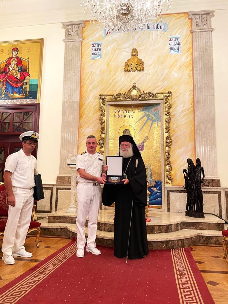 Από την πλευρά τους,ο επίσης παριστάμενος Διοικητής της Ναυτικής Δύναμης της Επιχείρησης του ΝΑΤΟ, Πλοίαρχος Π.Ν. κ. Ιωάννης Ρέτσος και οι Κυβερνήτες των πολεμικών πλοίων Φ/Γ «Regina Maria», Διοικητής κ.Mitel Laurentiu Alexandru και Φ/Γ «Ναυαρίνο», Αντιπλοίαρχος Π.Ν. κ. Στυλιανός Μαδεντζίδης, εξέφρασαν την χαρά και την ευλογία, την οποία αισθάνθηκαν επισκεπτόμενοι την Πατριαρχική Καθέδρα, ενώ επήνεσαν την θυσιαστικώς επιτελουμένη διακονία της Δευτεροθρόνου Εκκλησίας στην Αφρικανική ήπειρο. Ακολούθησε ανταλλαγή αναμνηστικών δώρων.