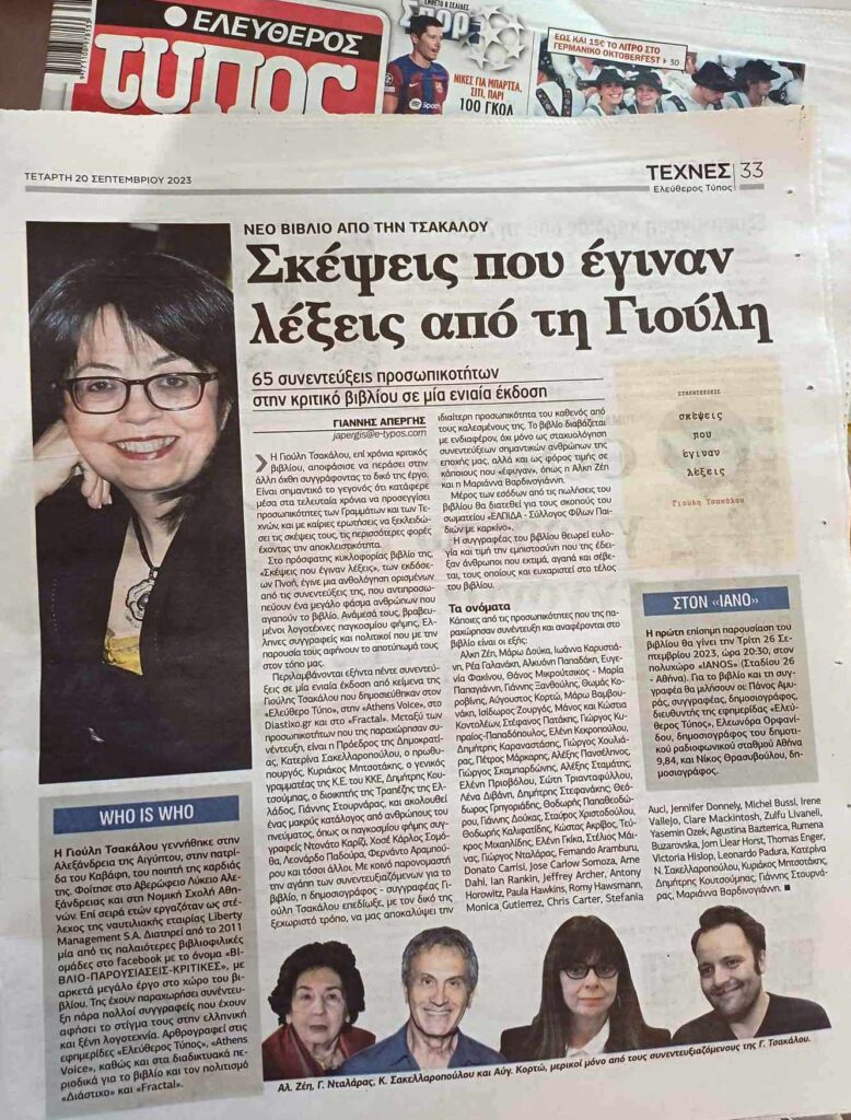Με κοινό παρανομαστή την αγάπη των συνεντευξιαζόμενων για το βιβλίο, η δημοσιογράφος-συγγραφέας Γιούλη Τσακάλου επεδίωξε με τον δικό της ξεχωριστό τρόπο να μας αποκαλύψει την ιδιαίτερη προσωπικότητα του καθενός από τους επίσημους καλεσμένους της. Το βιβλίο διαβάζεται με ενδιαφέρον, όχι μόνο ως σταχυολόγηση συνεντεύξεων σημαντικών ανθρώπων της εποχής μας, αλλά και ως φόρος τιμής σε κάποιους που έφυγαν όπως η κυρία Αλκη Ζέη και η κυρία Μαριάννα Βαρδινογιάννη.