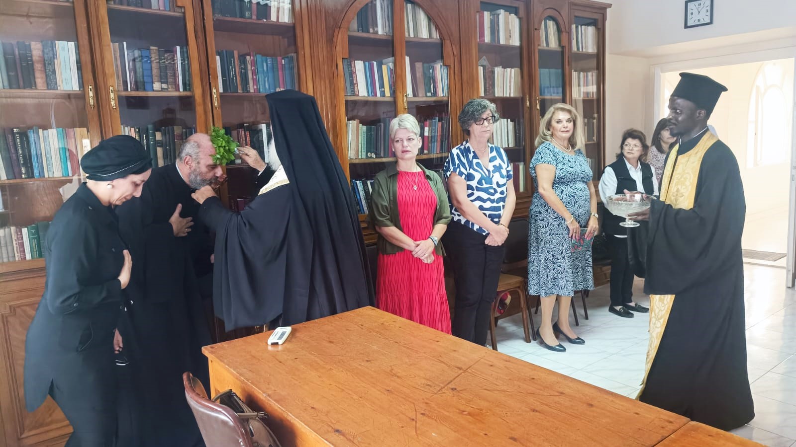 Στην τελετή του Αγιασμού παρέστησαν οι Σεβ. Μητροπολίτες Πηλουσίου κ. Νάρκισσος, Πατριαρχικός Επίτροπος Αλεξανδρείας και Ταμιάθεως κ. Γερμάνος, Προϊστάμενος της Ι. Μονής Οσίου Σάββα, ο Πλοίαρχος Π.Ν. κ. Κωνσταντίνος Βαρουξής, σύνδεσμος του Ελληνικού Πολεμικού Ναυτικού με το αντίστοιχο Αιγυπτιακό, εκπαιδευτικοί, Πρόεδροι και εκπρόσωποι Ελληνικών Συλλόγων και φορέων της Μ. Πόλεως.