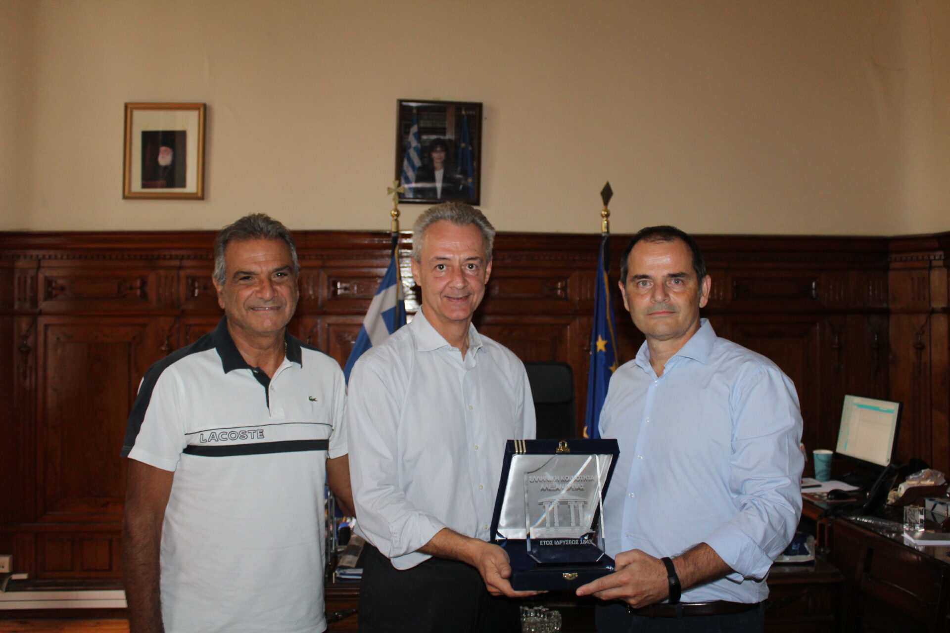 Τον απερχόμενο, Εξοχότατο Γενικό Πρόξενο και Πρέσβυ στον βαθμό, κ. Αθανάσιο Κοτσιώνη, επισκέφθηκαν σήμερα στο Γενικό Προξενείο της Ελλάδας στην Αλεξάνδρεια, ο Πρόεδρος κ. Ανδρέας Βαφειάδης και ο Αντιπρόεδρος κ. Ιωάννης Παπαδόπουλος, της Ελληνικής Κοινότητας Αλεξανδρείας, για να τον αποχαιρετήσουν και να του προσφέρουν αναμνηστική πλακέτα εκ μέρους σύμπασας της Κοινοτικής Επιτροπής.