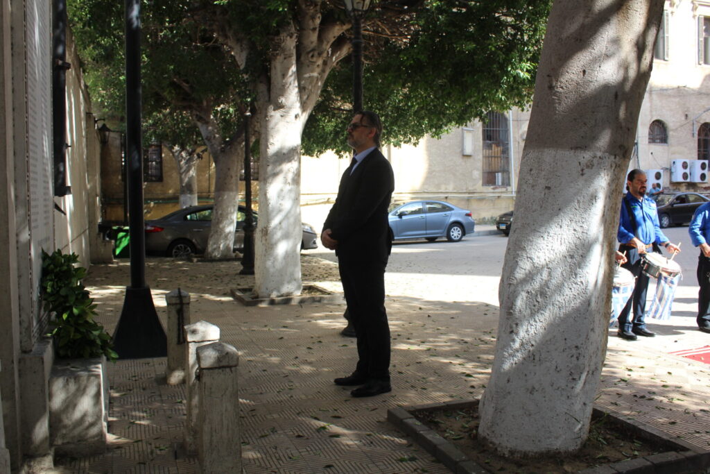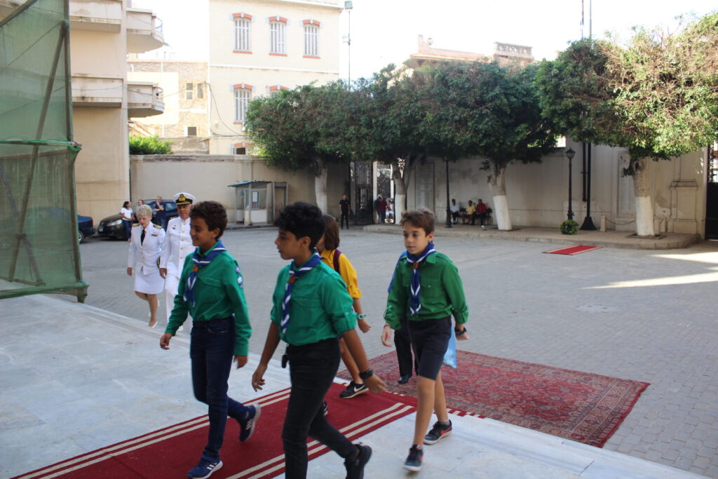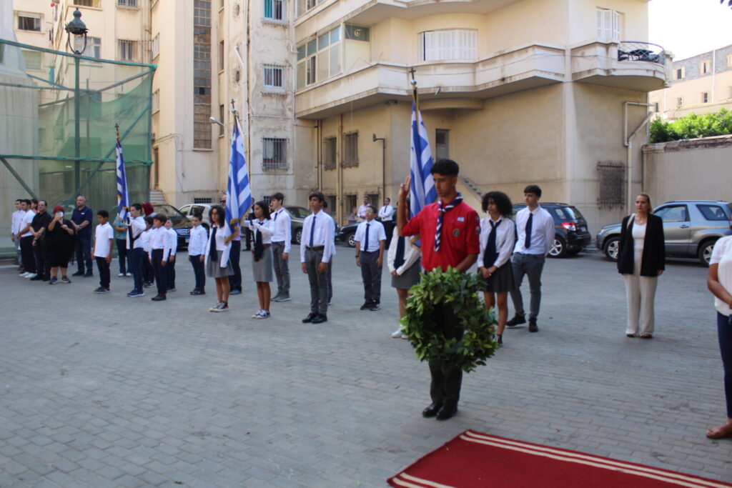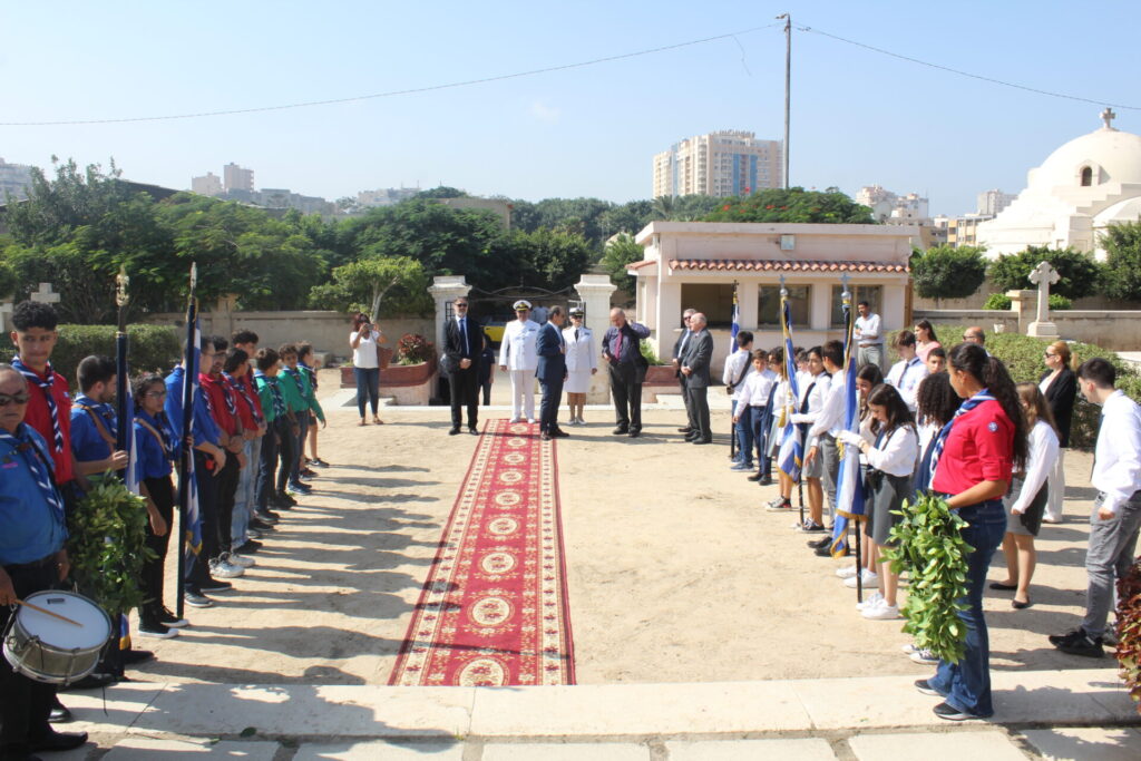 Λίγο αργότερα στον περίβολο του Ευαγγελισμού, ακούστηκαν τα τύμπανα της Μη Λήθης. Οι Βαθμοφόροι της Προσκοπικής Μπάντας, αποτελούμενη από την «παλιοσειρά» κ. Τζόνι Μύρο, και τον διευθυντή της Κοινότητας κ. Γεώργιο Μπούλο, προσέδωσαν τον πρέποντα σεβασμό στο όλο τελετουργικό. Ακούστηκαν οι δύο εθνικοί ύμνοι Ελλάδος και Αιγύπτου, ο δε Γενικός Πρόξενος κ. Ιωάννης Πυργάκης, με τον Πρόεδρο της Ελληνικής Κοινότητος κ. Ανδρέα Βαφειάδη καταθέτοντας στεφάνους στα μνημεία με τα ονόματα πεσόντων, τίμησαν εκείνους που με το δικό τους «ΟΧΙ», επέτρεψαν στην Ελλάδα και τους Έλληνες να συνεχίσουν να έχουν ιστορία, πολιτισμό, δημοκρατία, μνήμη και να υψώνουν ελευθέρως τις σημαίες τους!