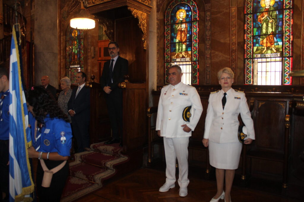 Από νωρίς τα Λυκόπουλα, οι Πρόσκοποι και οι μαθητές των Σχολείων της Ελληνικής Κοινότητας είχαν πάρει τις θέσεις τους έξωθεν του Ιερού Ναού και στη συνέχεια με τάξη και σεβασμό προς το κλέος της ημέρας, παρατάχθηκαν με τις σημαίες σχηματίζοντας ένα διάδρομο. Κι όταν εδόθη το σήμα απ΄ τον Έφορο Διοίκησης κ. Άρη Μαρκοζάνη τα εμβλήματα του έθνους έγειραν στα χέρια των σημαιοφόρων και απεικόνισαν την τιμή προς τους νεκρούς και την υπόσχεση της αιωνίας υπενθυμίσεως.