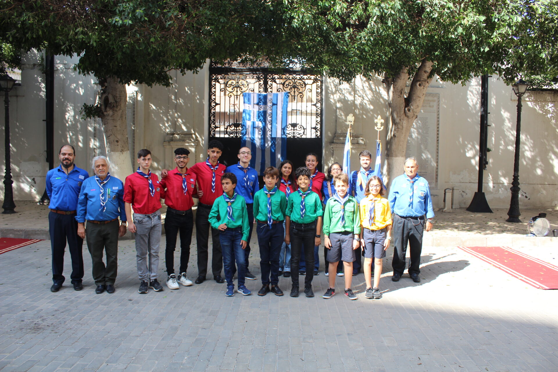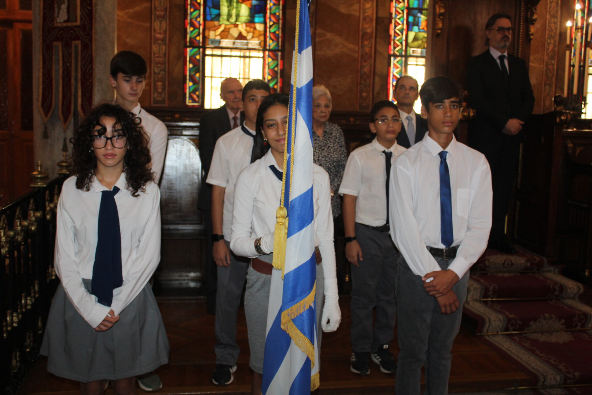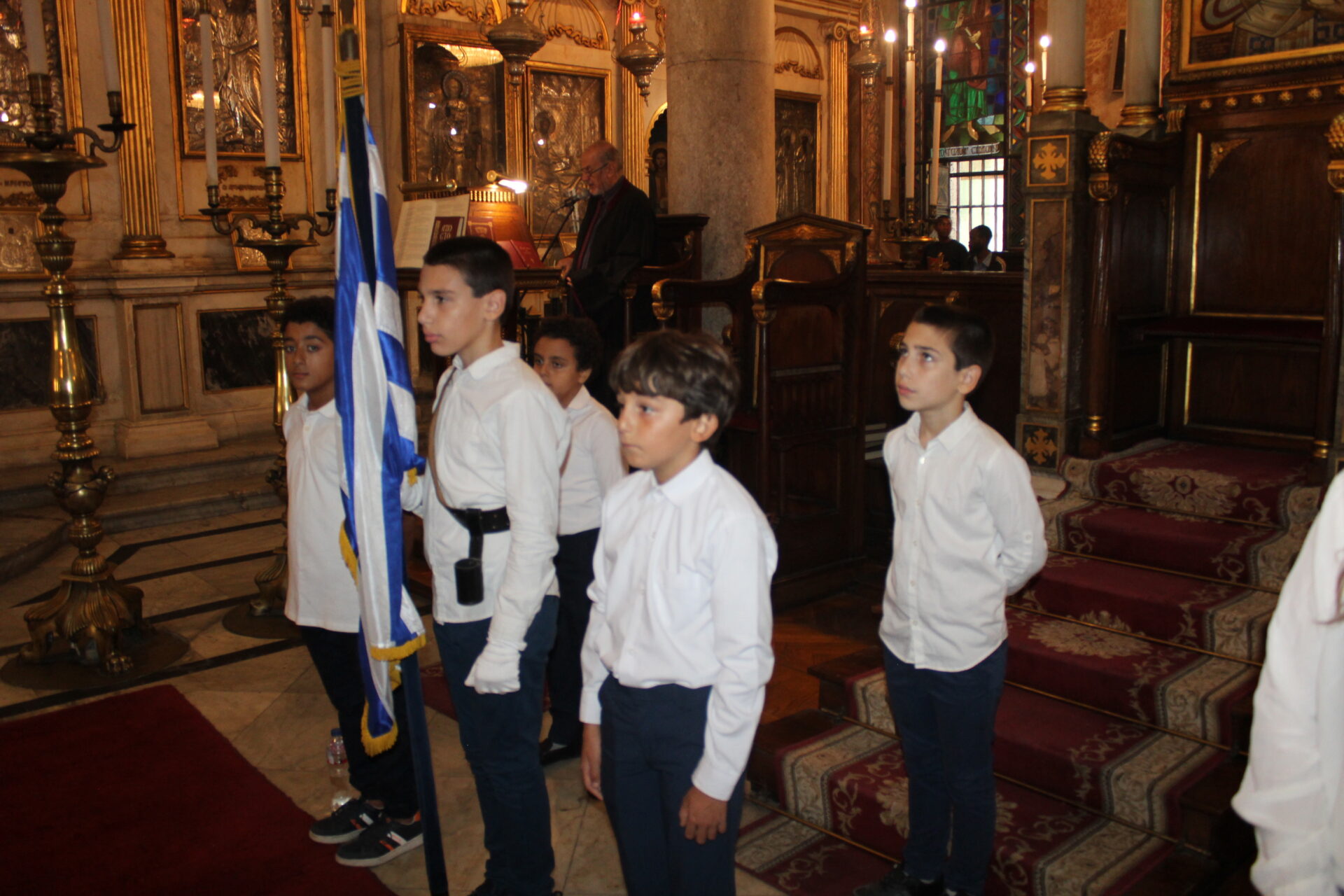 Από νωρίς τα Λυκόπουλα, οι Πρόσκοποι και οι μαθητές των Σχολείων της Ελληνικής Κοινότητας είχαν πάρει τις θέσεις τους έξωθεν του Ιερού Ναού και στη συνέχεια με τάξη και σεβασμό προς το κλέος της ημέρας, παρατάχθηκαν με τις σημαίες σχηματίζοντας ένα διάδρομο. Κι όταν εδόθη το σήμα απ΄ τον Έφορο Διοίκησης κ. Άρη Μαρκοζάνη τα εμβλήματα του έθνους έγειραν στα χέρια των σημαιοφόρων και απεικόνισαν την τιμή προς τους νεκρούς και την υπόσχεση της αιωνίας υπενθυμίσεως.