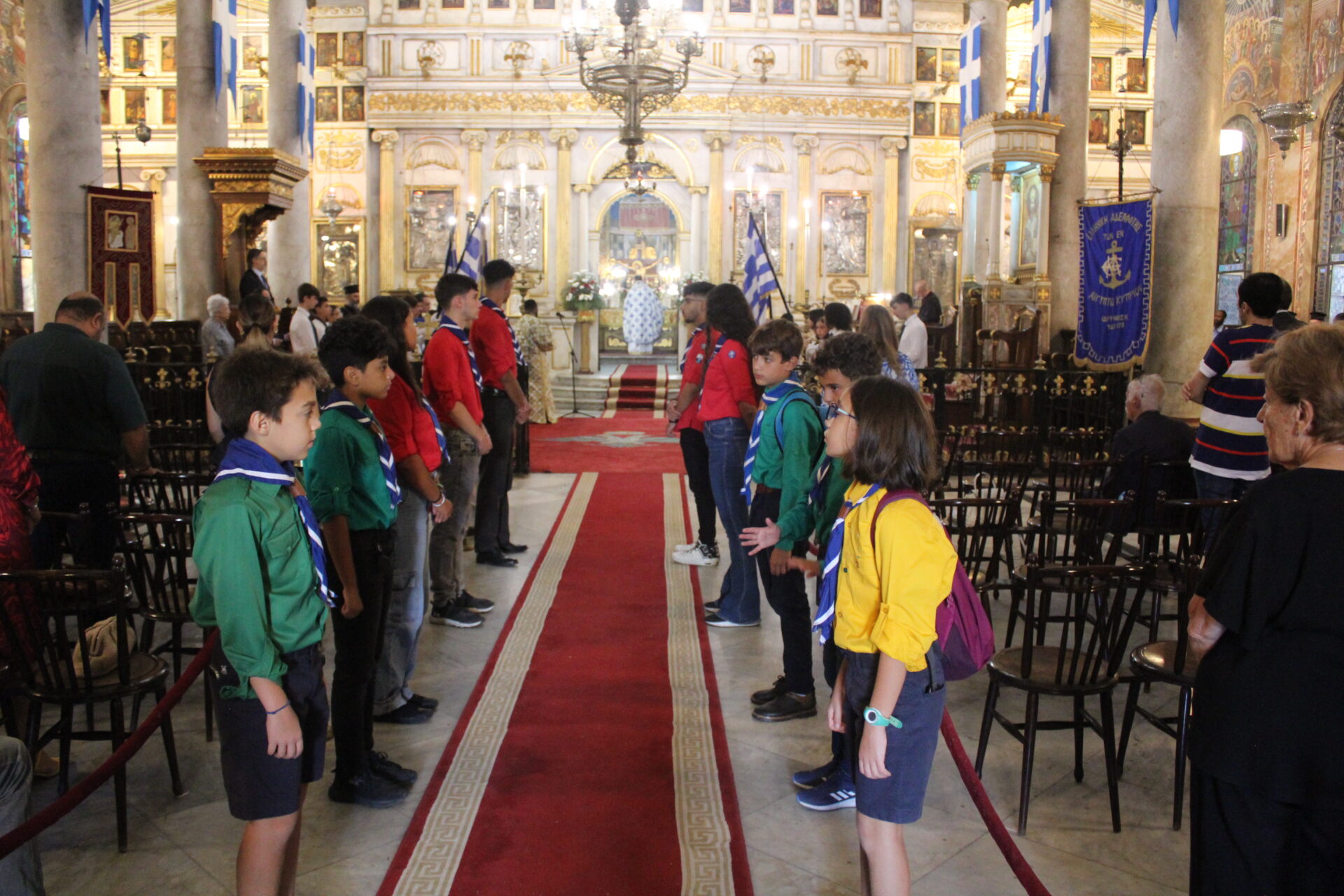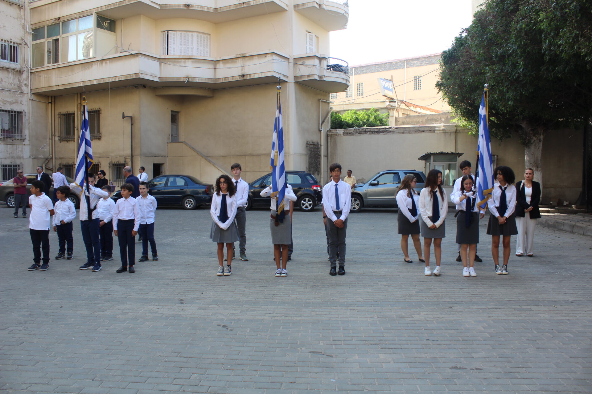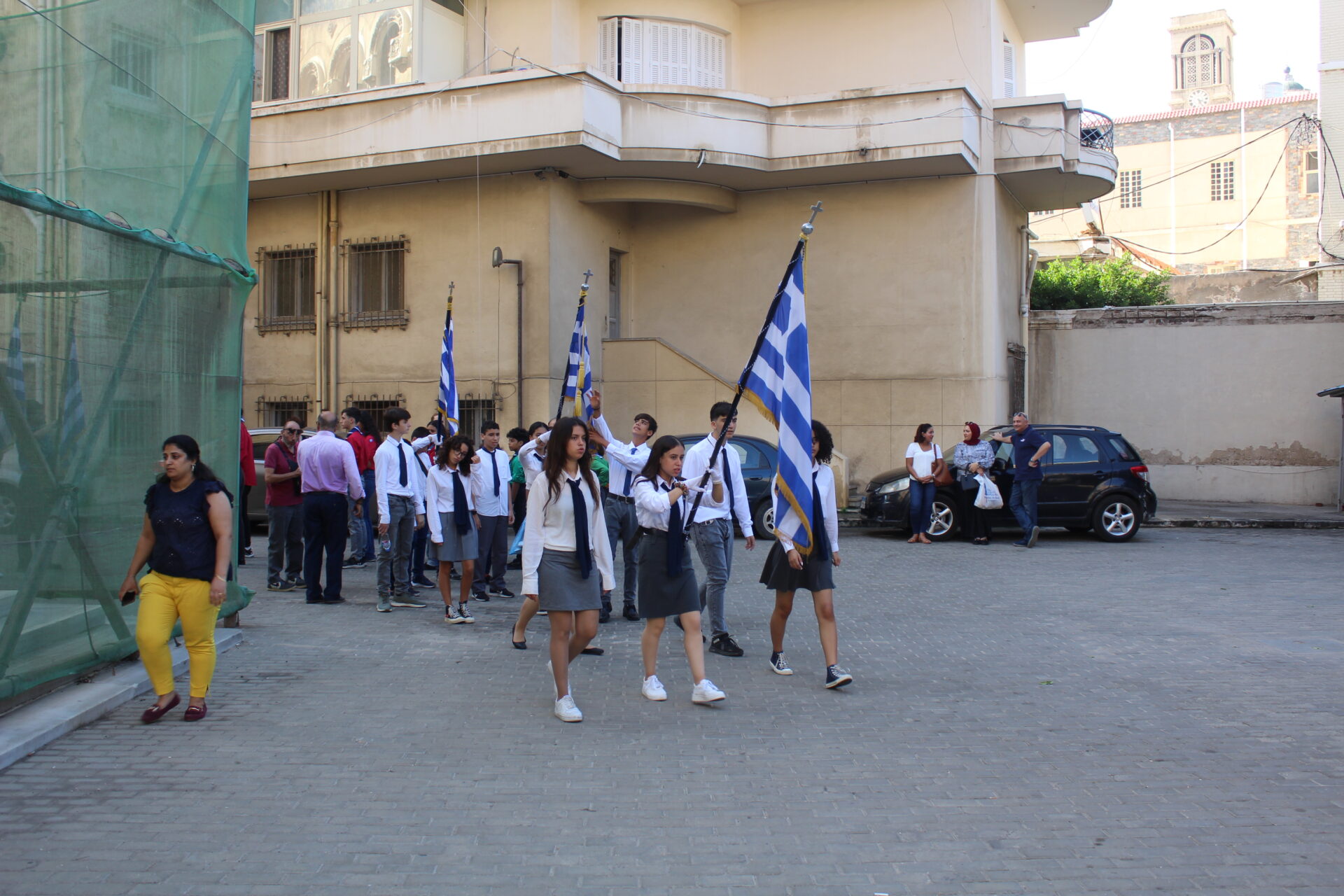 Από νωρίς τα Λυκόπουλα, οι Πρόσκοποι και οι μαθητές των Σχολείων της Ελληνικής Κοινότητας είχαν πάρει τις θέσεις τους έξωθεν του Ιερού Ναού και στη συνέχεια με τάξη και σεβασμό προς το κλέος της ημέρας, παρατάχθηκαν με τις σημαίες σχηματίζοντας ένα διάδρομο. Κι όταν εδόθη το σήμα απ΄ τον Έφορο Διοίκησης κ. Άρη Μαρκοζάνη τα εμβλήματα του έθνους έγειραν στα χέρια των σημαιοφόρων και απεικόνισαν την τιμή προς τους νεκρούς και την υπόσχεση της αιωνίας υπενθυμίσεως.
