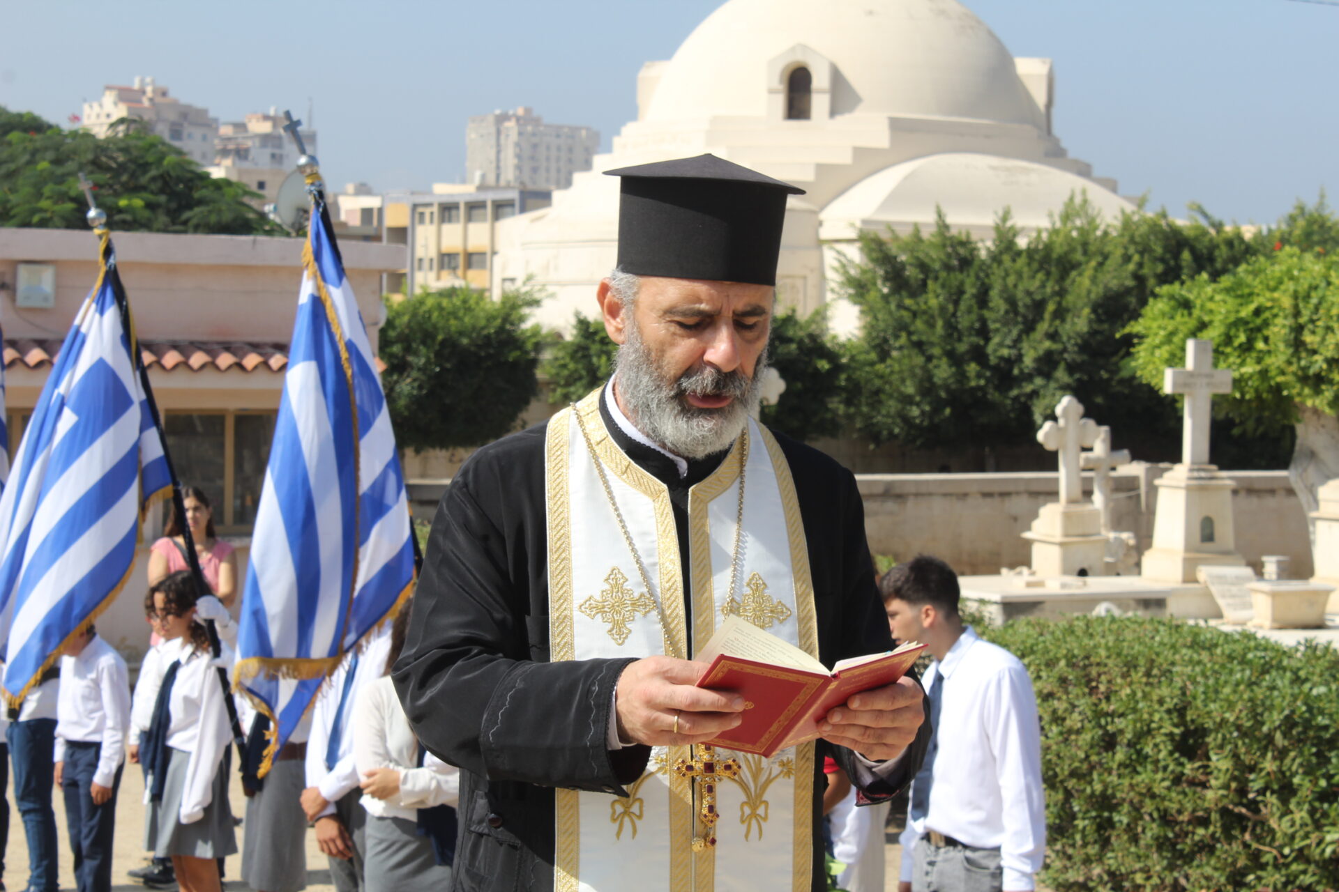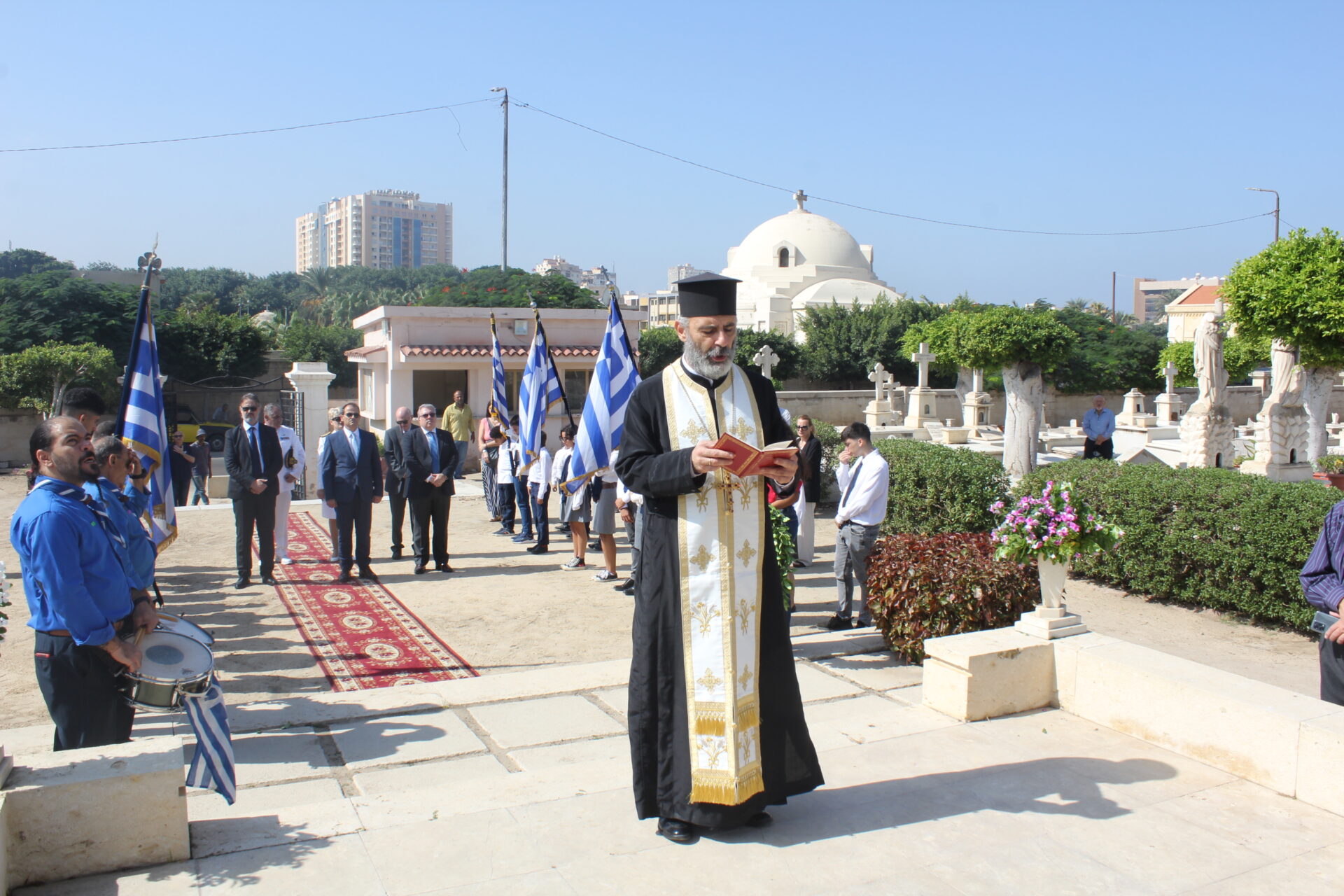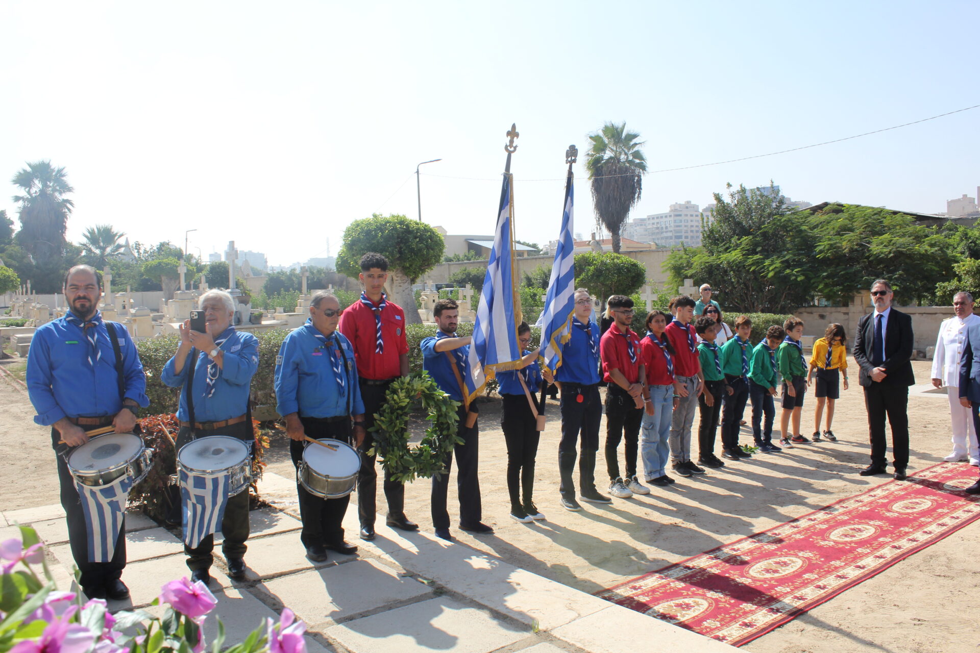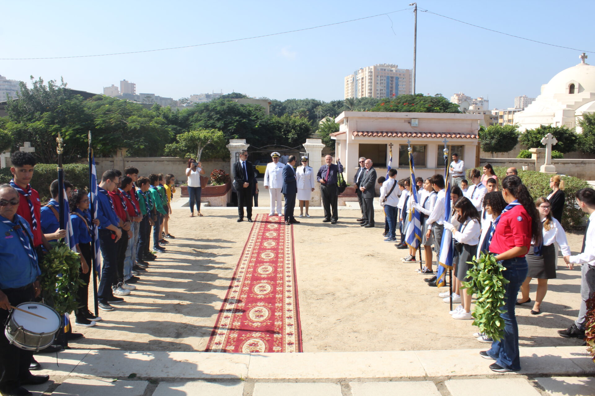Λίγο αργότερα στον περίβολο του Ευαγγελισμού, ακούστηκαν τα τύμπανα της Μη Λήθης. Οι Βαθμοφόροι της Προσκοπικής Μπάντας, αποτελούμενη από την «παλιοσειρά» κ. Τζόνι Μύρο, και τον διευθυντή της Κοινότητας κ. Γεώργιο Μπούλο, προσέδωσαν τον πρέποντα σεβασμό στο όλο τελετουργικό. Ακούστηκαν οι δύο εθνικοί ύμνοι Ελλάδος και Αιγύπτου, ο δε Γενικός Πρόξενος κ. Ιωάννης Πυργάκης, με τον Πρόεδρο της Ελληνικής Κοινότητος κ. Ανδρέα Βαφειάδη καταθέτοντας στεφάνους στα μνημεία με τα ονόματα πεσόντων, τίμησαν εκείνους που με το δικό τους «ΟΧΙ», επέτρεψαν στην Ελλάδα και τους Έλληνες να συνεχίσουν να έχουν ιστορία, πολιτισμό, δημοκρατία, μνήμη και να υψώνουν ελευθέρως τις σημαίες τους!