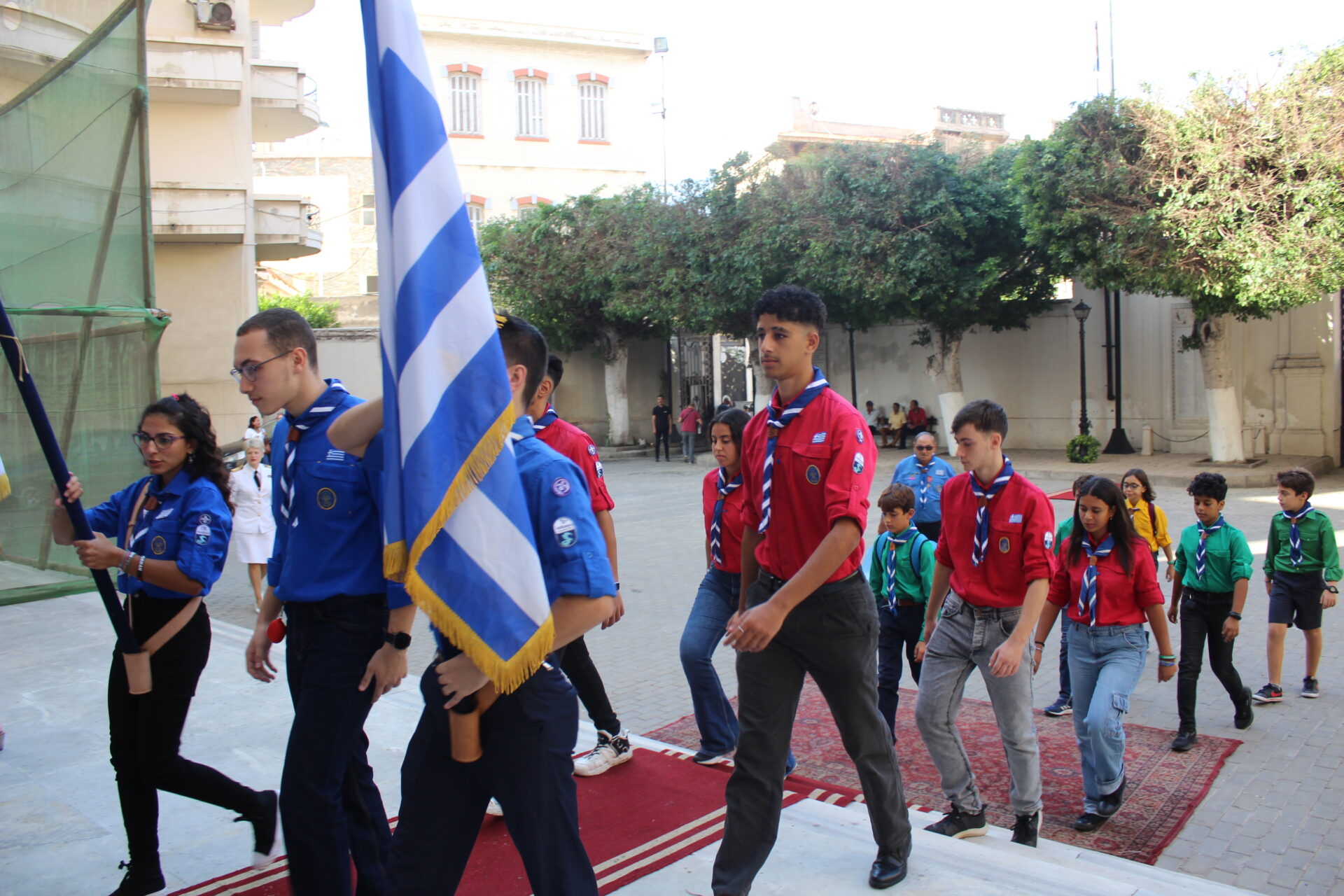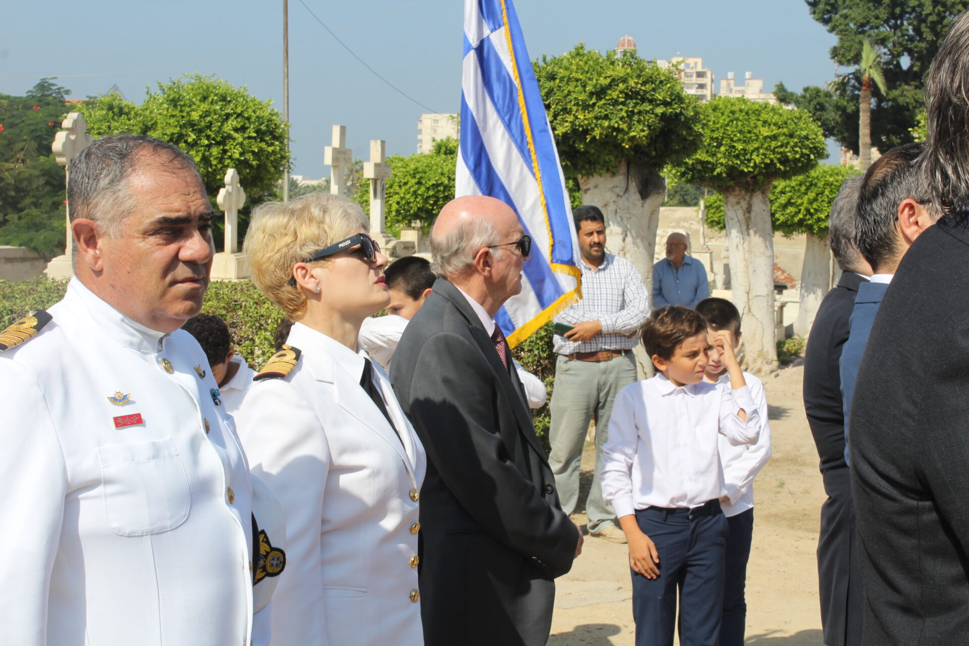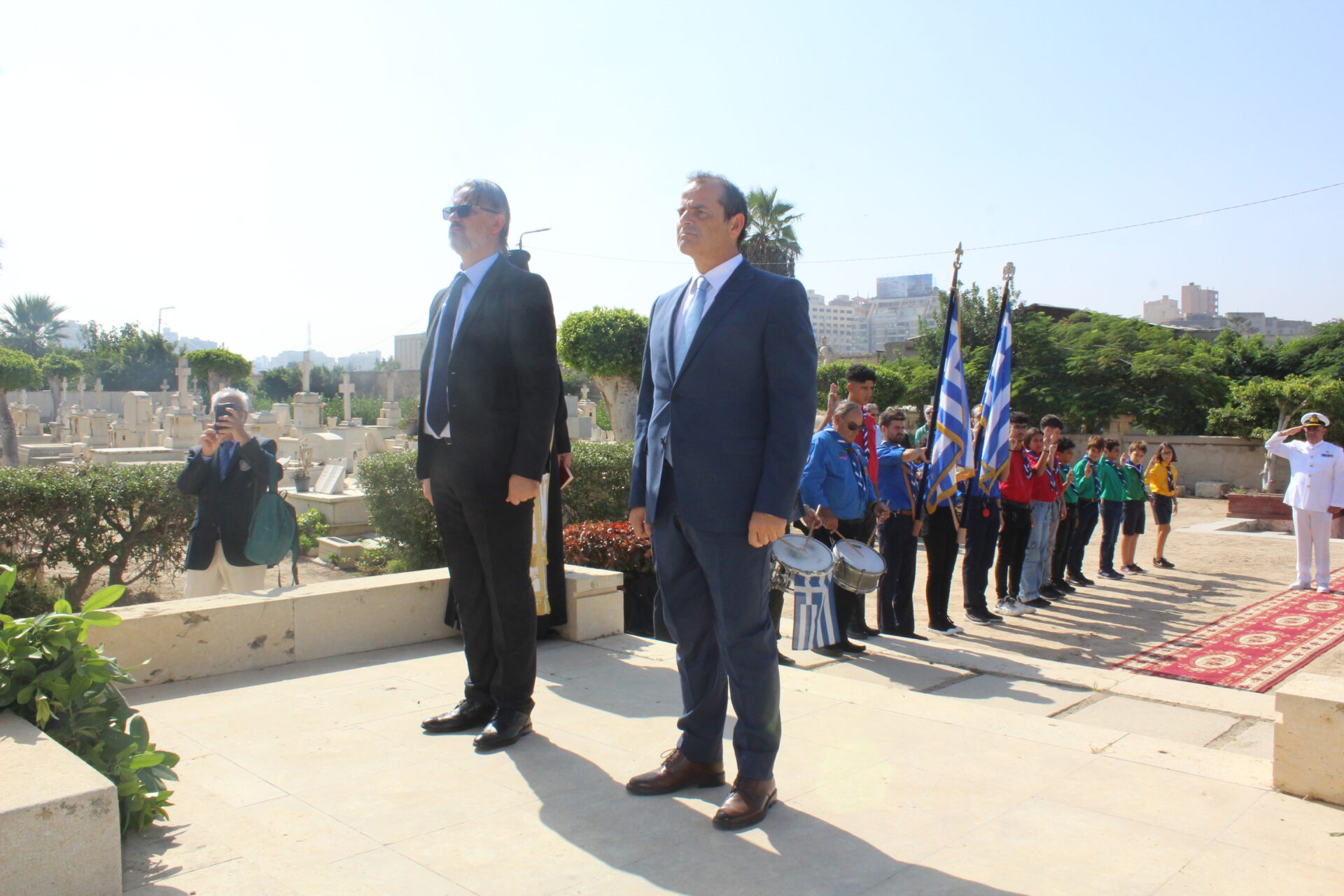 Λίγο αργότερα στον περίβολο του Ευαγγελισμού, ακούστηκαν τα τύμπανα της Μη Λήθης. Οι Βαθμοφόροι της Προσκοπικής Μπάντας, αποτελούμενη από την «παλιοσειρά» κ. Τζόνι Μύρο, και τον διευθυντή της Κοινότητας κ. Γεώργιο Μπούλο, προσέδωσαν τον πρέποντα σεβασμό στο όλο τελετουργικό. Ακούστηκαν οι δύο εθνικοί ύμνοι Ελλάδος και Αιγύπτου, ο δε Γενικός Πρόξενος κ. Ιωάννης Πυργάκης, με τον Πρόεδρο της Ελληνικής Κοινότητος κ. Ανδρέα Βαφειάδη καταθέτοντας στεφάνους στα μνημεία με τα ονόματα πεσόντων, τίμησαν εκείνους που με το δικό τους «ΟΧΙ», επέτρεψαν στην Ελλάδα και τους Έλληνες να συνεχίσουν να έχουν ιστορία, πολιτισμό, δημοκρατία, μνήμη και να υψώνουν ελευθέρως τις σημαίες τους!