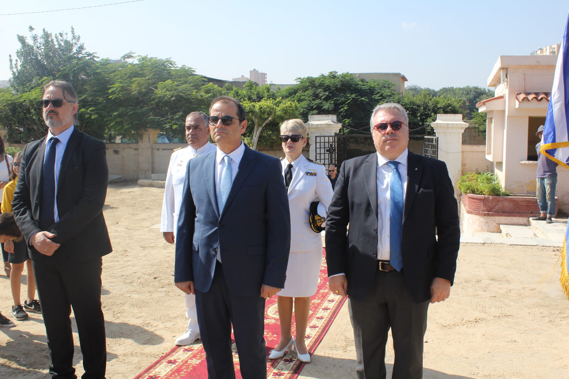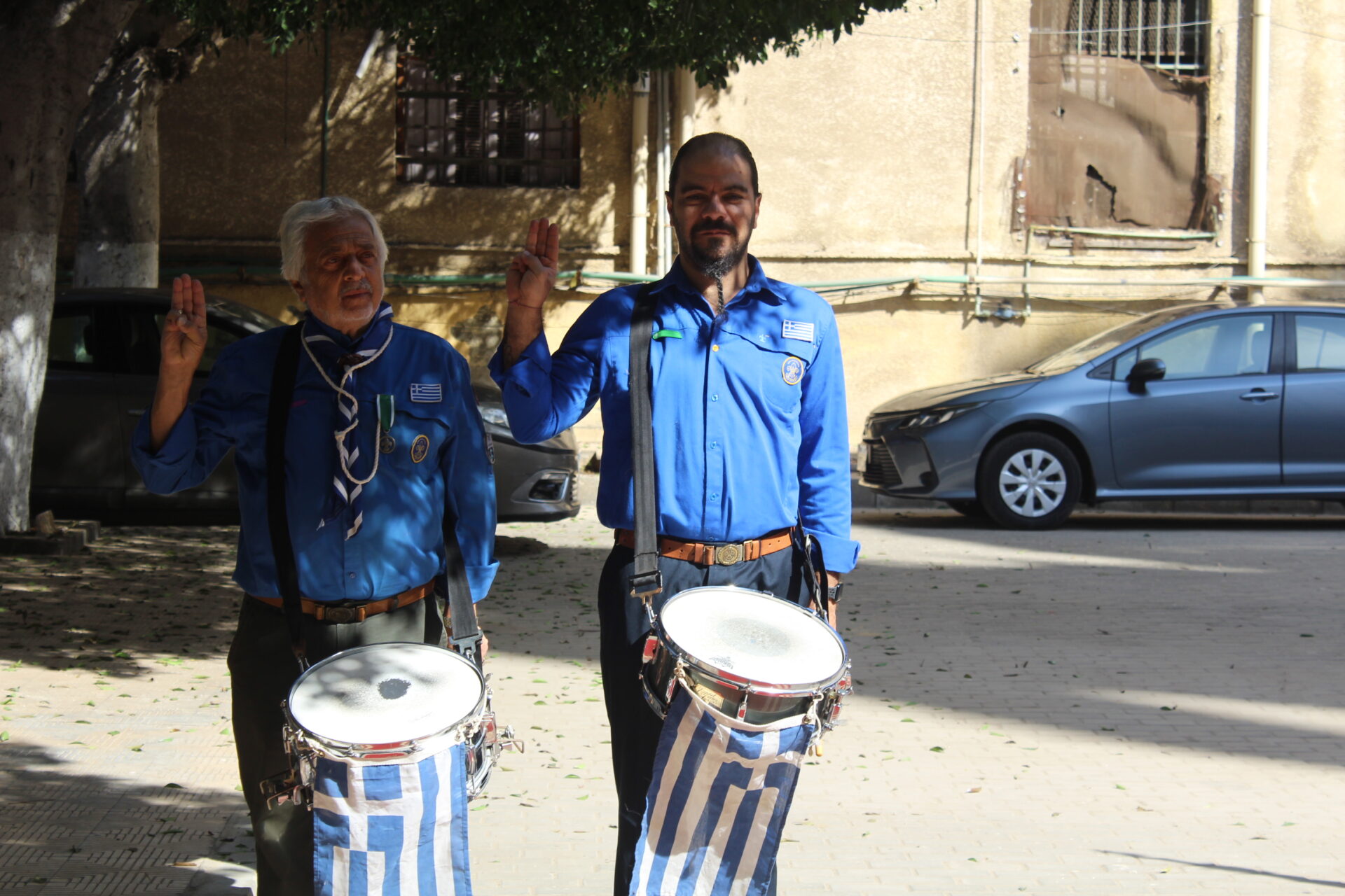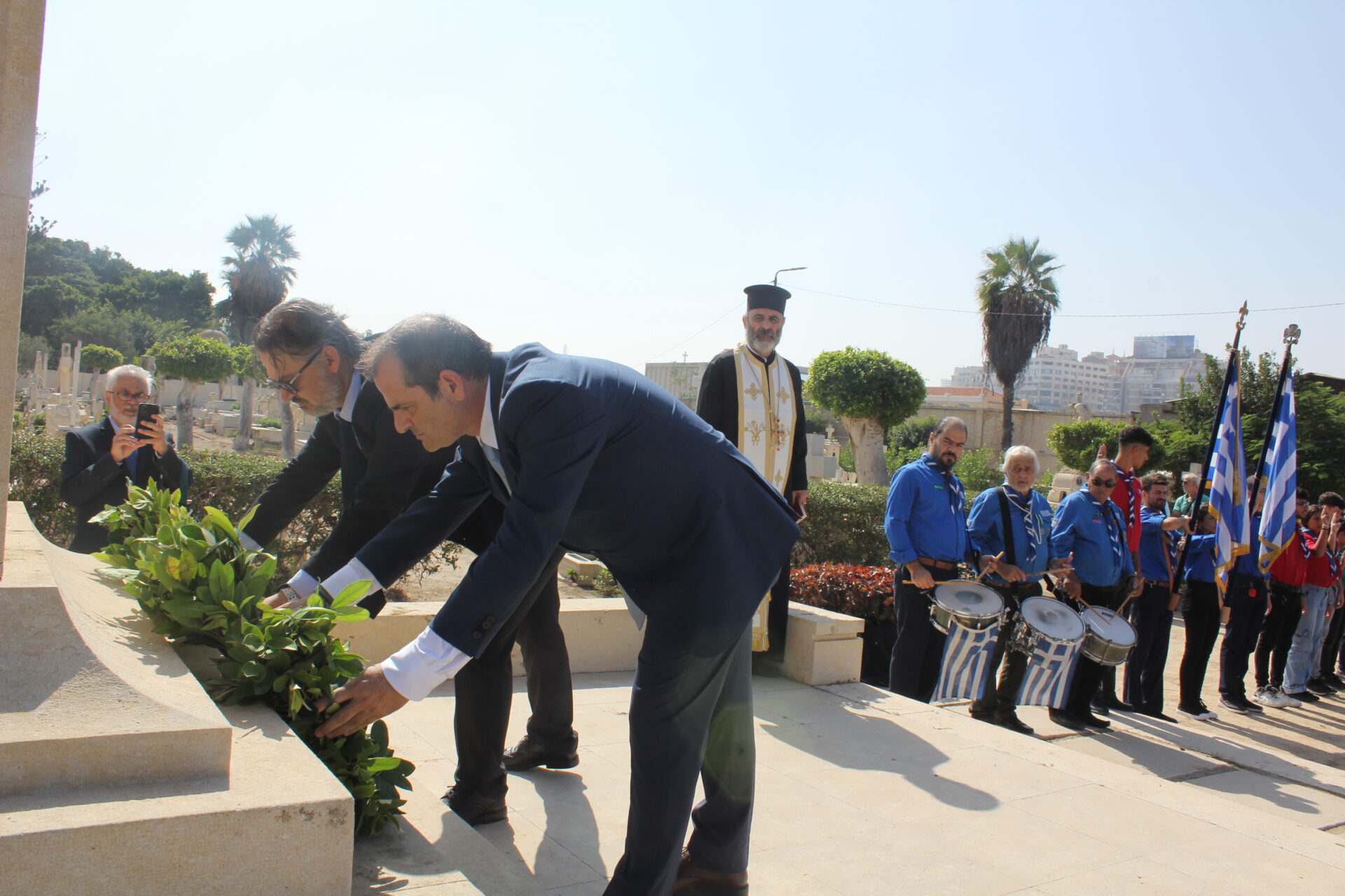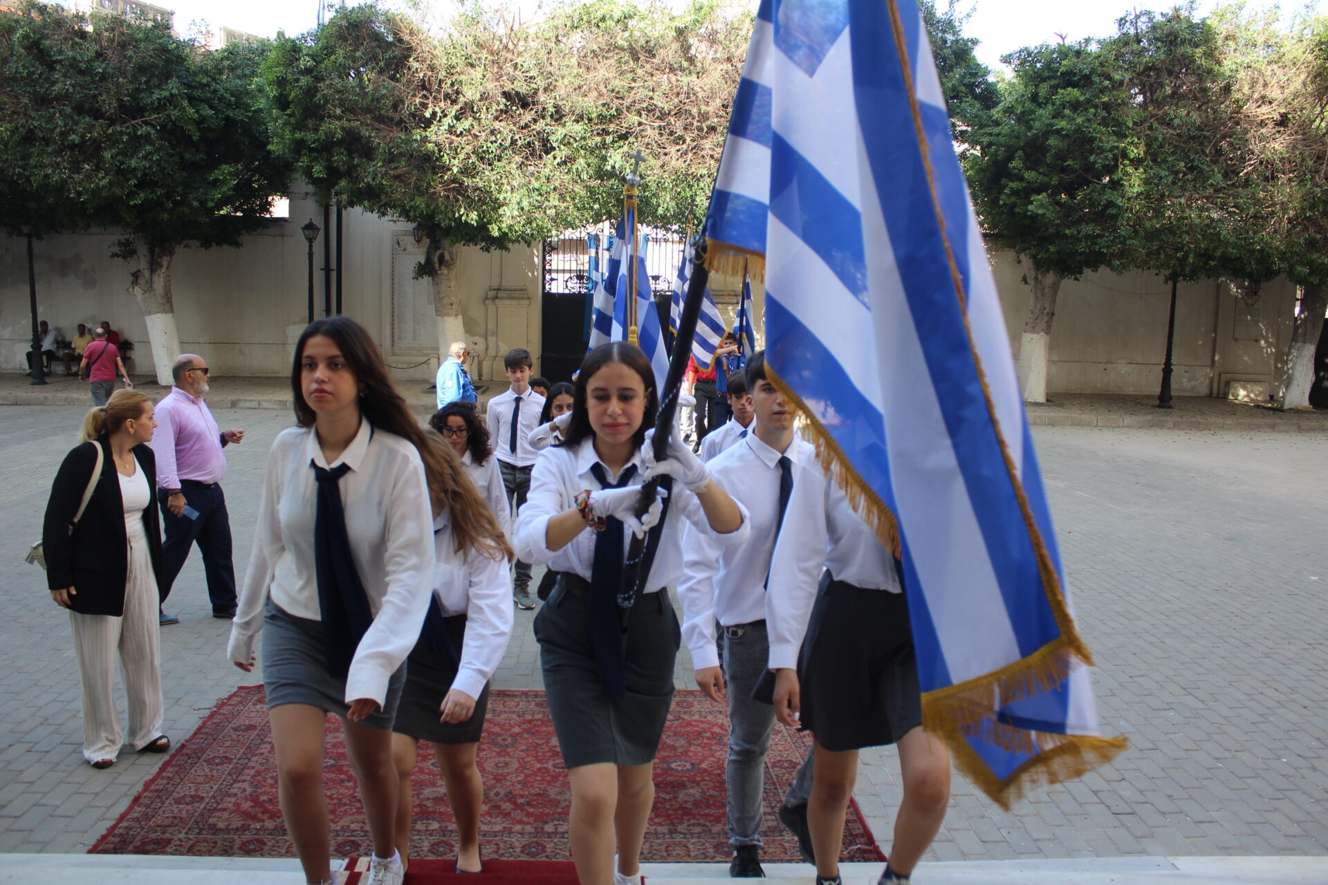 Λίγο αργότερα στον περίβολο του Ευαγγελισμού, ακούστηκαν τα τύμπανα της Μη Λήθης. Οι Βαθμοφόροι της Προσκοπικής Μπάντας, αποτελούμενη από την «παλιοσειρά» κ. Τζόνι Μύρο, και τον διευθυντή της Κοινότητας κ. Γεώργιο Μπούλο, προσέδωσαν τον πρέποντα σεβασμό στο όλο τελετουργικό. Ακούστηκαν οι δύο εθνικοί ύμνοι Ελλάδος και Αιγύπτου, ο δε Γενικός Πρόξενος κ. Ιωάννης Πυργάκης, με τον Πρόεδρο της Ελληνικής Κοινότητος κ. Ανδρέα Βαφειάδη καταθέτοντας στεφάνους στα μνημεία με τα ονόματα πεσόντων, τίμησαν εκείνους που με το δικό τους «ΟΧΙ», επέτρεψαν στην Ελλάδα και τους Έλληνες να συνεχίσουν να έχουν ιστορία, πολιτισμό, δημοκρατία, μνήμη και να υψώνουν ελευθέρως τις σημαίες τους!