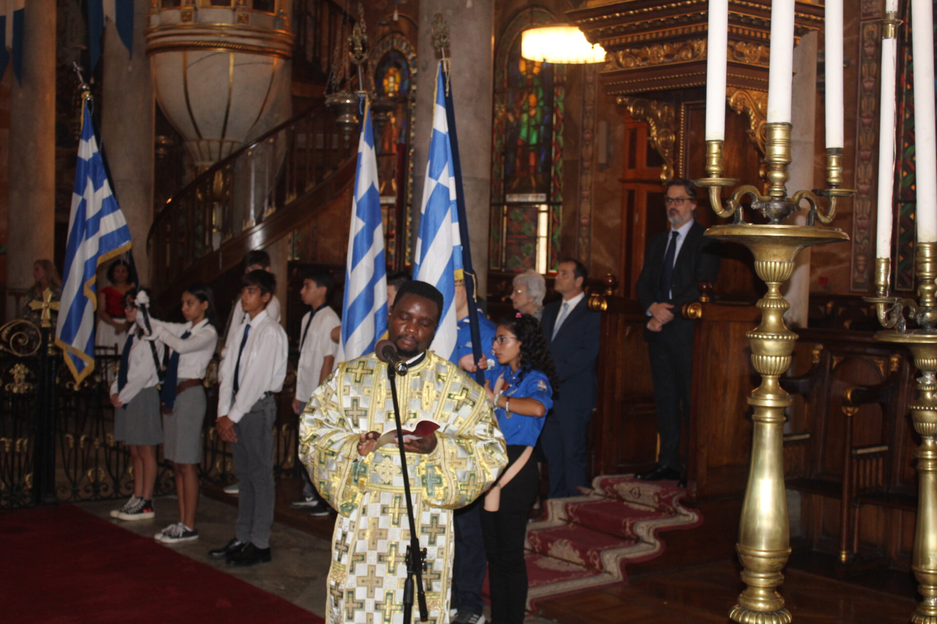 Ο Πάπας και Πατριάρχης Αλεξανδρείας και πάσης Αφρικής κ.κ. Θεόδωρος Β’ παρέστη συμπροσευχόμενος από του Ιερού Βήματος κατά την τελεσθείσα Θεία Λειτουργία, με την ικανοποίηση στο πρόσωπο πηγάζουσα εκ της εθνικής έπαρσης, συμπαραστατούμενος από τους Σεβασμιωτάτους Μητροπολίτες Ναυκράτιδος κ. Παντελεήμονα, Αρχιγραμματέα της Αγίας και Ιεράς Συνόδου, Πηλουσίου κ. Νάρκισσο, Πατριαρχικό Επίτροπο Αλεξανδρείας, Ταμιάθεως κ. Γερμανό, Προϊστάμενο της Ιεράς Πατριαρχικής Μονής Οσίου Σάββα του Ηγιασμένου Αλεξανδρείας και τον Πανοσιολογιότατο Αρχιμανδρίτη και Σχολάρχη της Πατριαρχικής Σχολής κ. Ισαάκ, τον Αιδεσιμολογιώτατο Πρωτοπρεσβύτερο π. Πάνο Γαζή στο ψαλτήρι με την ρωμαλέα «βυζαντινότροπη» φωνή του και μαζί του σύμπασα η τάξη των μαθητών της ιερατικής σχολής και με τον εκπαιδευτικό κ. Αλέξανδρο Μπάση, προσέδωσε την πρέπουσα τιμή, καθώς προέστη της επισήμου Δοξολογίας ως και της επιμνημόσυνης δεήσεως υπέρ των πεσόντων Αιγυπτιωτών αγωνιστών κατά το εθνικό έπος του έτους 1940.