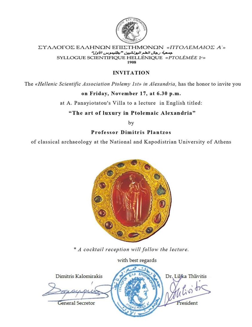 Ενδιαφέρουσα Διάλεξη με τίτλο “Η Τέχνη της πολυτέλειας στην Πτολεμαϊκή Αλεξάνδρεια” δίνει ο καθηγητής κ. Δημήτρης Πλάντζος την Παρασκευή 17ης Νοεμβρίου 2023 και ώρα 18:30 στον “Πτολεμαίο Α΄” .