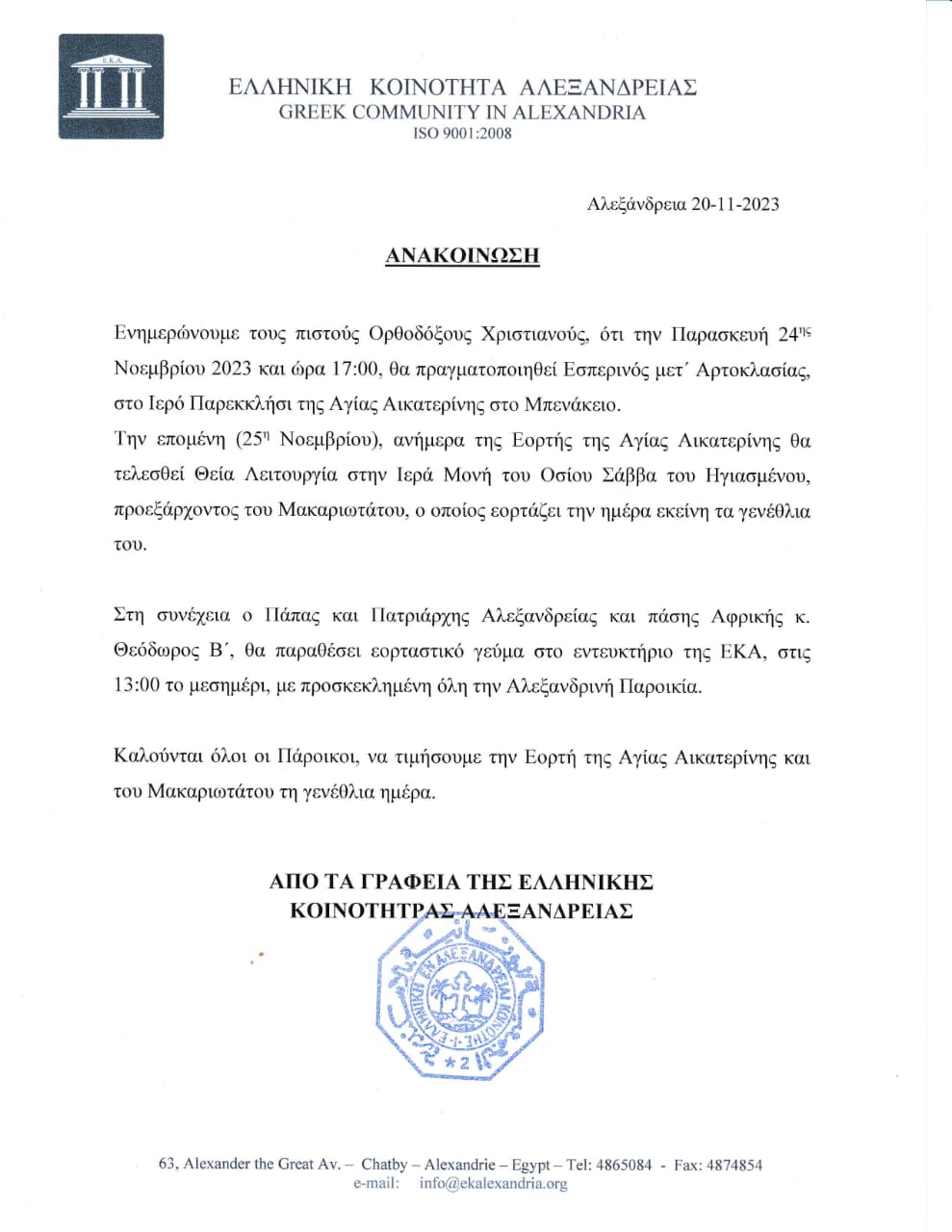 Εορτή Αγίας Αικατερίνης - Γενέθλια Πατριάρχη