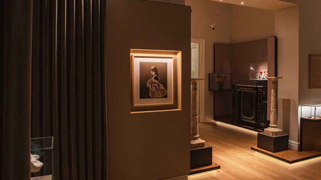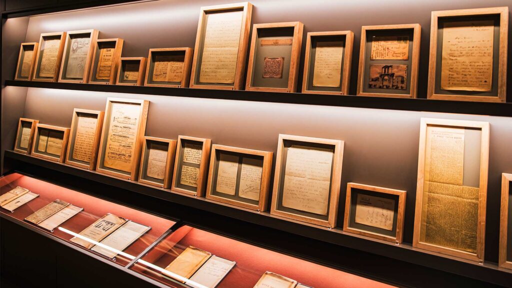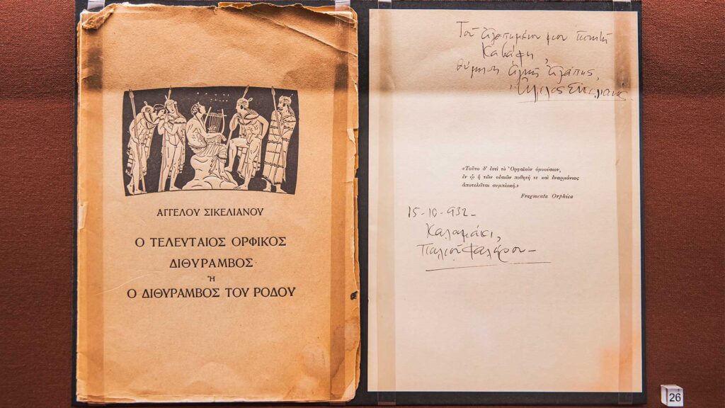 Στο ανακαινισμένο κτίριο των αρχών του 20ού αιώνα, οι προσεγμένοι, «μπουτίκ» εκθεσιακοί του χώροι προσφέρουν αποσπασματικές εικόνες του έργου και της εμβέλειας του ποιητή. Ξεχωρίζουν τεκμήρια όπως η βαθυπράσινη πολυθρόνα που συνήθιζε να κάθεται, ένα από τα πολλά τούρκικα χαλιά που υπήρχαν στο σπίτι του (και τα οποία έστρωνε το ένα πάνω στο άλλο), μια σκαλιστή κομόδα, τα εμβληματικά γυαλιά του (σε πιστό αντίγραφο από το πρωτότυπο, που φυλάσσεται σε ασφαλή χώρο).