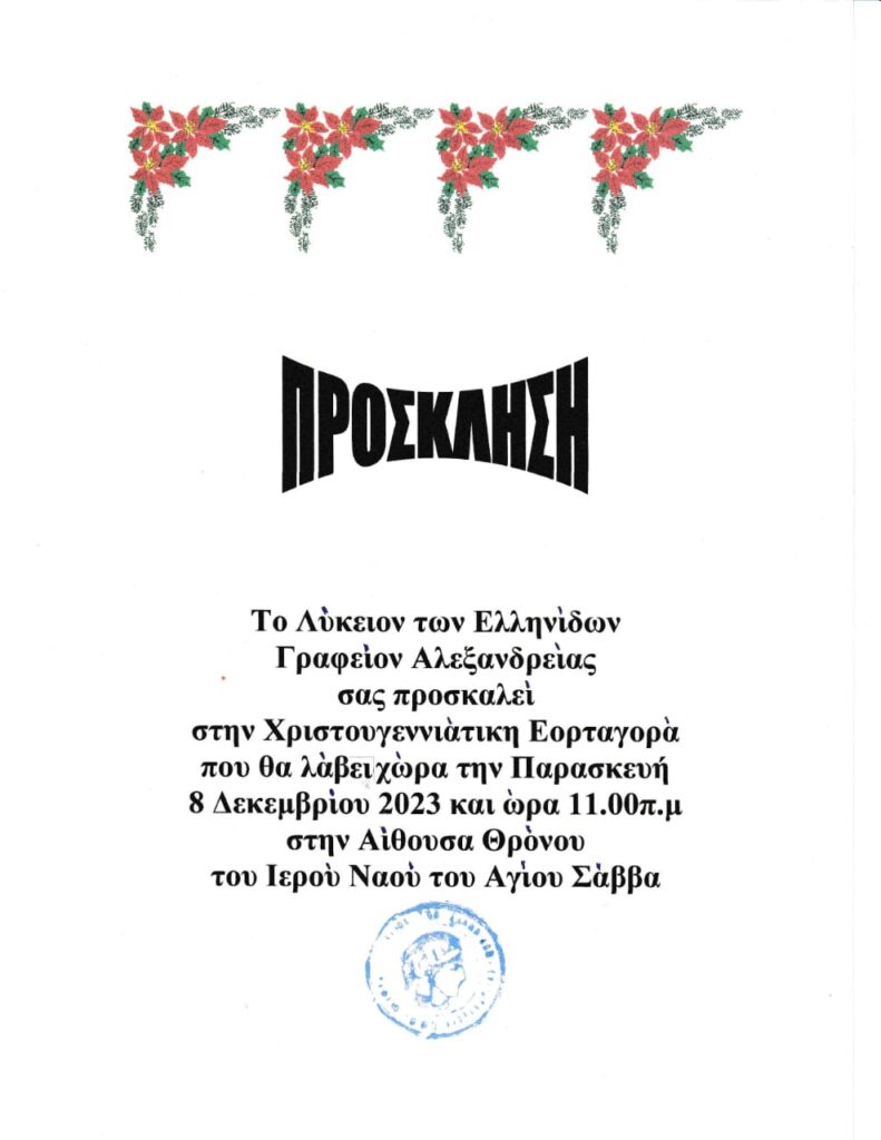Το Λύκειο Ελληνίδων Γραφείον Αλεξανδρείας, σας προσκαλεί την Παρασκευή 8ης Δεκεμβρίου 2023 και ώρα 11η π.μ., στην Χριστουγεννιάτικη Εορταγορά, η οποία θα λάβει χώρα στην Αίθουσα του Θρόνου της Ιεράς Μονής του Οσίου Σάββα του Ηγιασμένου, όπως κάθε χρόνο!