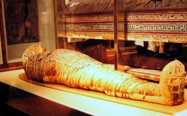 Τα περιτυλίγματα της μούμιας ήταν κομμένα από ληστές στην αρχαιότητα με μαχαίρι που βρέθηκε στο σημείο ταφής.