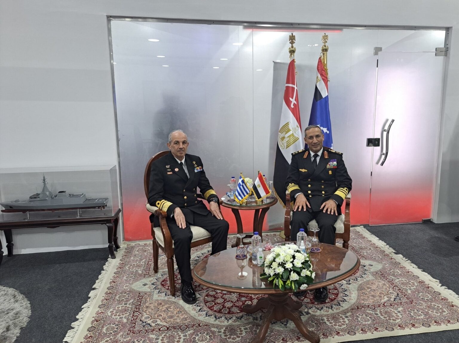 Στο πλαίσιο της επίσκεψής του, ο Αρχηγός ΓΕΝ είχε κατ’ ιδίαν συνάντηση με τον Αιγύπτιο ομόλογό του. Σε αυτή συζητήθηκαν θέματα αμοιβαίου ενδιαφέροντος και επαύξησης της συνεργασίας των δύο Ναυτικών.